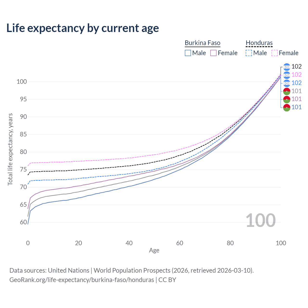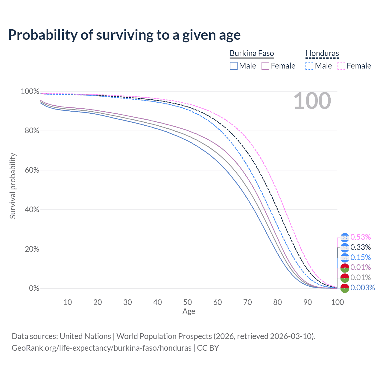 This life expectancy calculator shows the odds of living to 100, 95, 90, and below based on current age for both males and females in Burkina Faso and Honduras, along with mean and median age of death. The calculations are based on the 2026 life tables (actuarial tables) from the UN World Population Prospects.