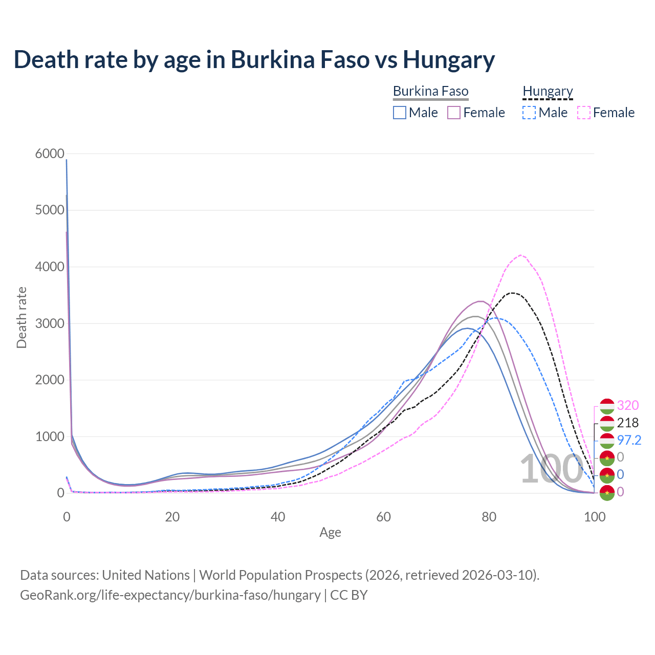 In Burkina Faso, the most common age of death is 0, compared to 84 in Hungary. The median age of death is 70.4 in Burkina Faso and 80.4 in Hungary, meaning only half of each cohort is expected to live past that age.