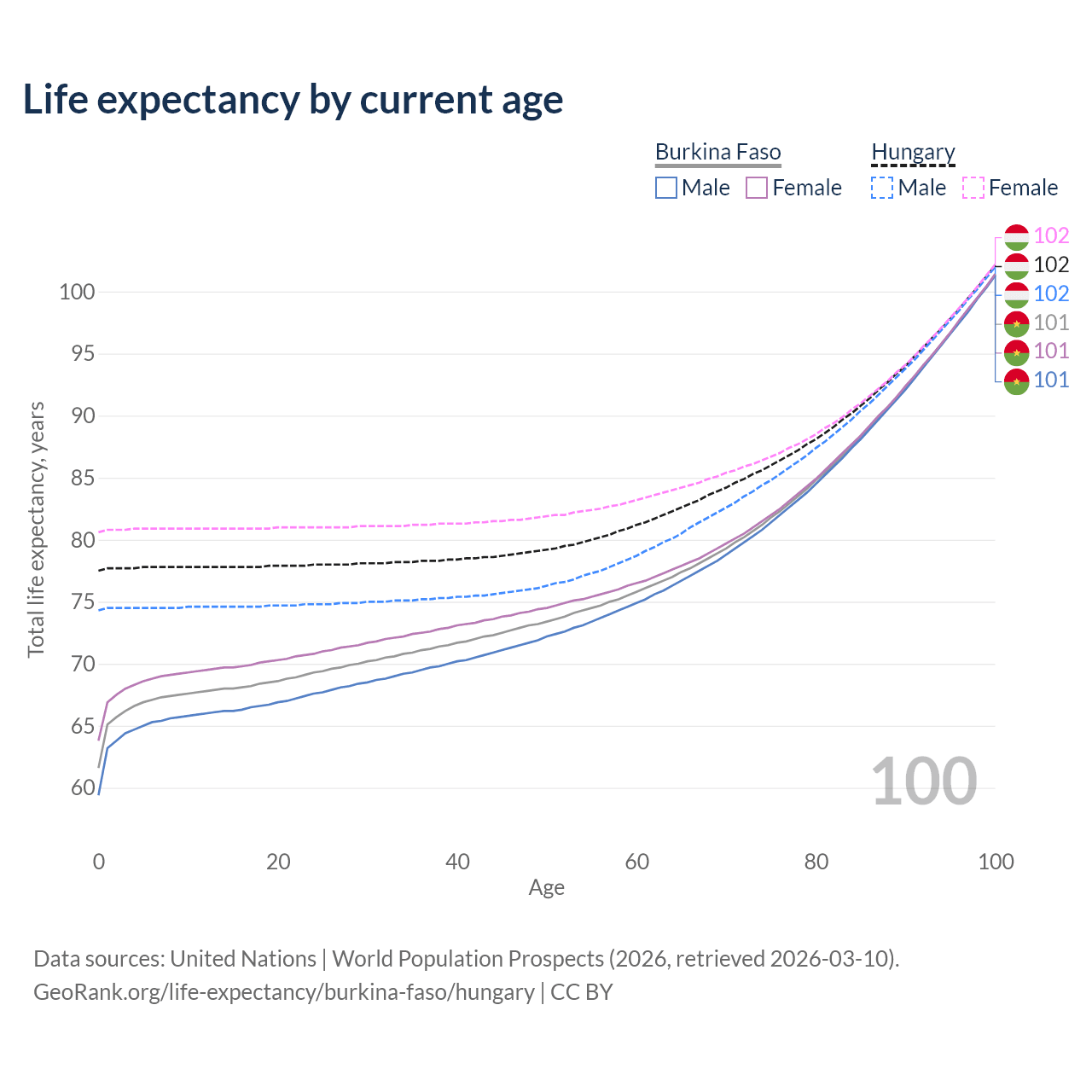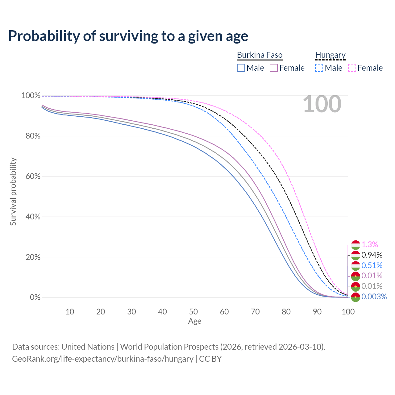 This life expectancy calculator shows the odds of living to 100, 95, 90, and below based on current age for both males and females in Burkina Faso and Hungary, along with mean and median age of death. The calculations are based on the 2026 life tables (actuarial tables) from the UN World Population Prospects.