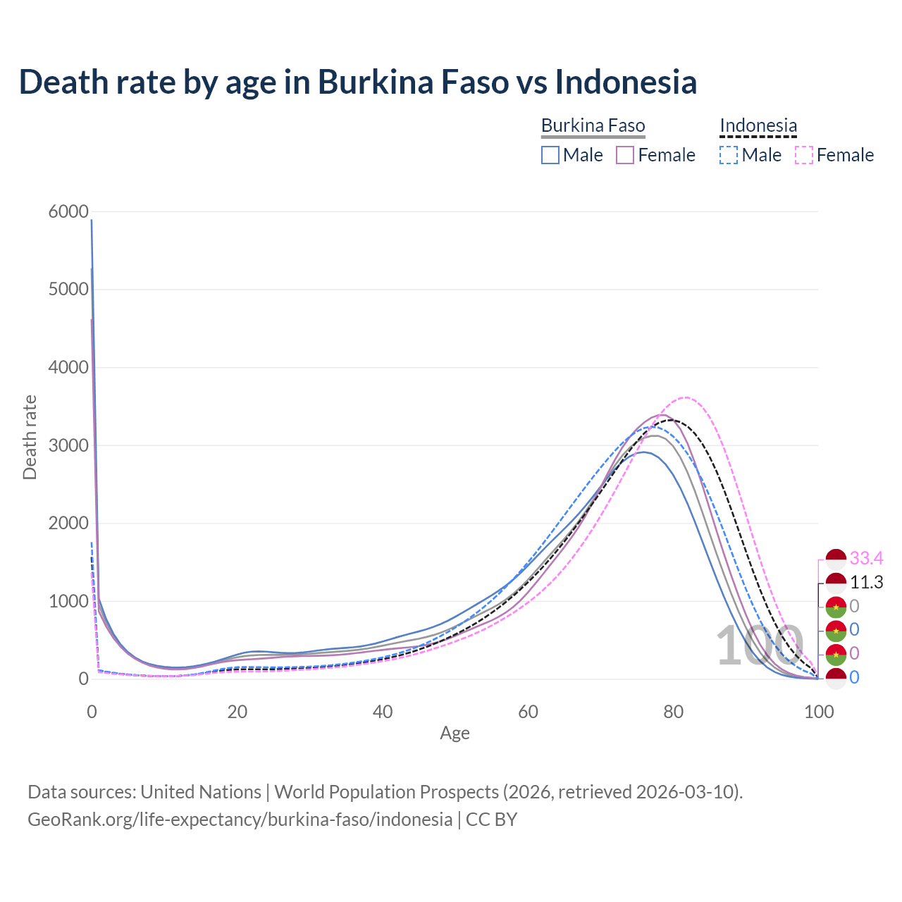 This life expectancy calculator shows the odds of living to 100, 95, 90, and below based on current age for both males and females in Burkina Faso and Indonesia, along with mean and median age of death. The calculations are based on the 2026 life tables (actuarial tables) from the UN World Population Prospects.