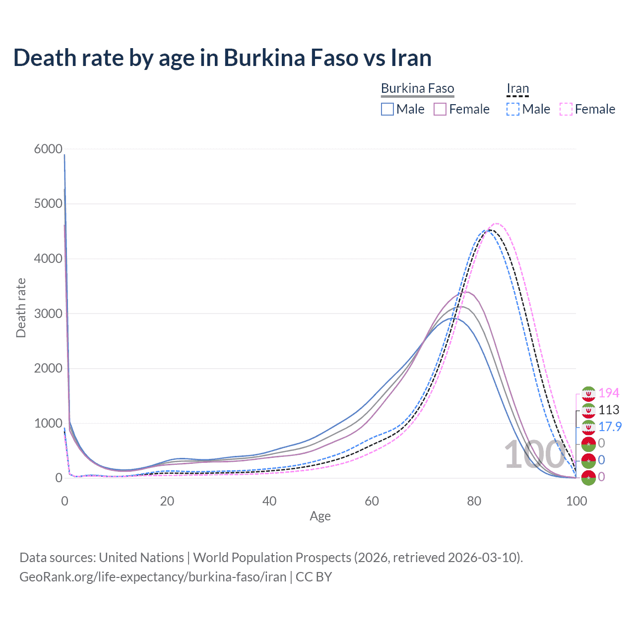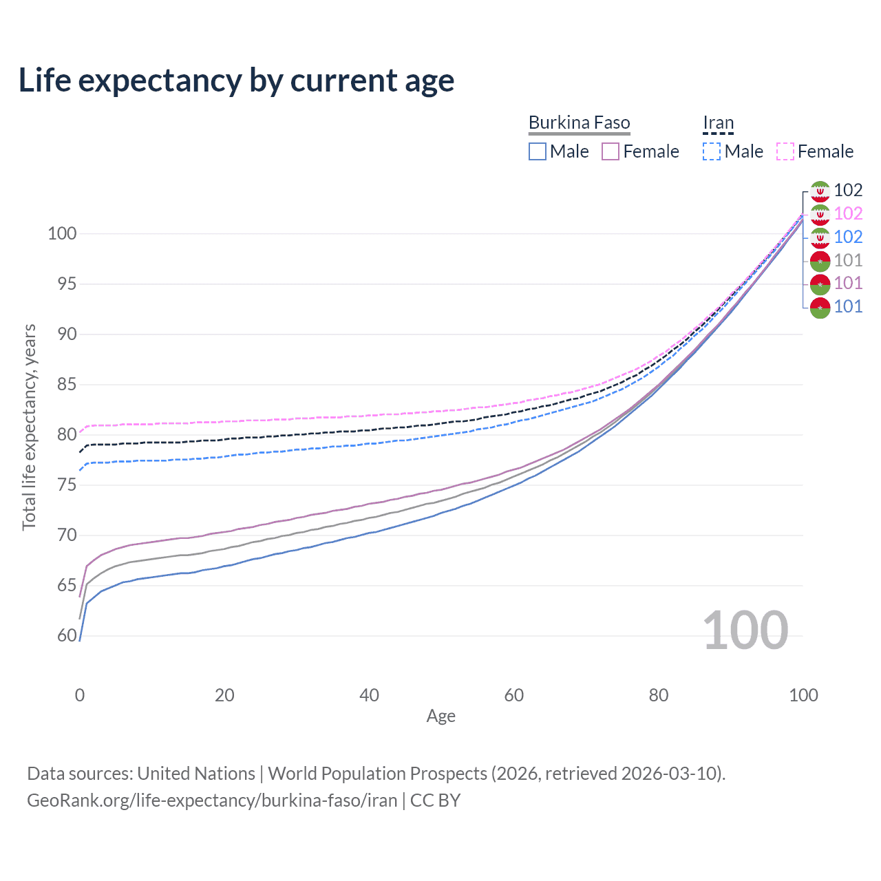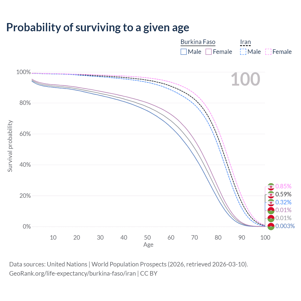 This life expectancy calculator shows the odds of living to 100, 95, 90, and below based on current age for both males and females in Burkina Faso and Iran, along with mean and median age of death. The calculations are based on the 2026 life tables (actuarial tables) from the UN World Population Prospects.
