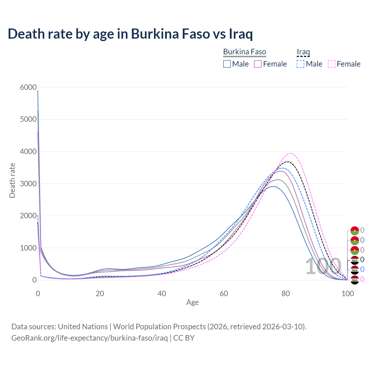 This life expectancy calculator shows the odds of living to 100, 95, 90, and below based on current age for both males and females in Burkina Faso and Iraq, along with mean and median age of death. The calculations are based on the 2026 life tables (actuarial tables) from the UN World Population Prospects.