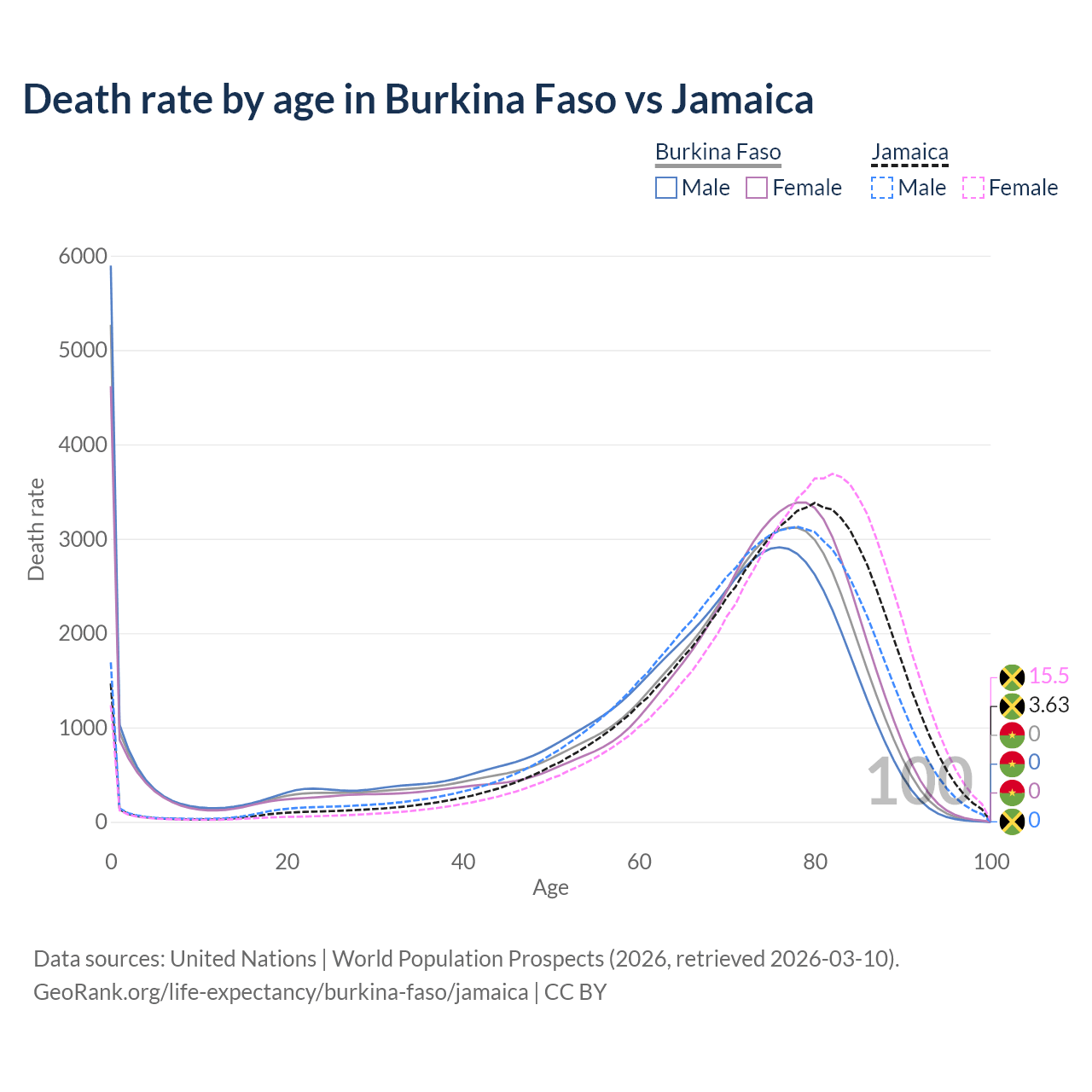 In Burkina Faso, the most common age of death is 0, compared to 80 in Jamaica. The median age of death is 70.4 in Burkina Faso and 75.7 in Jamaica, meaning only half of each cohort is expected to live past that age.