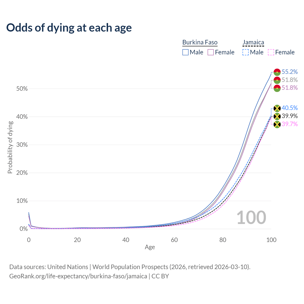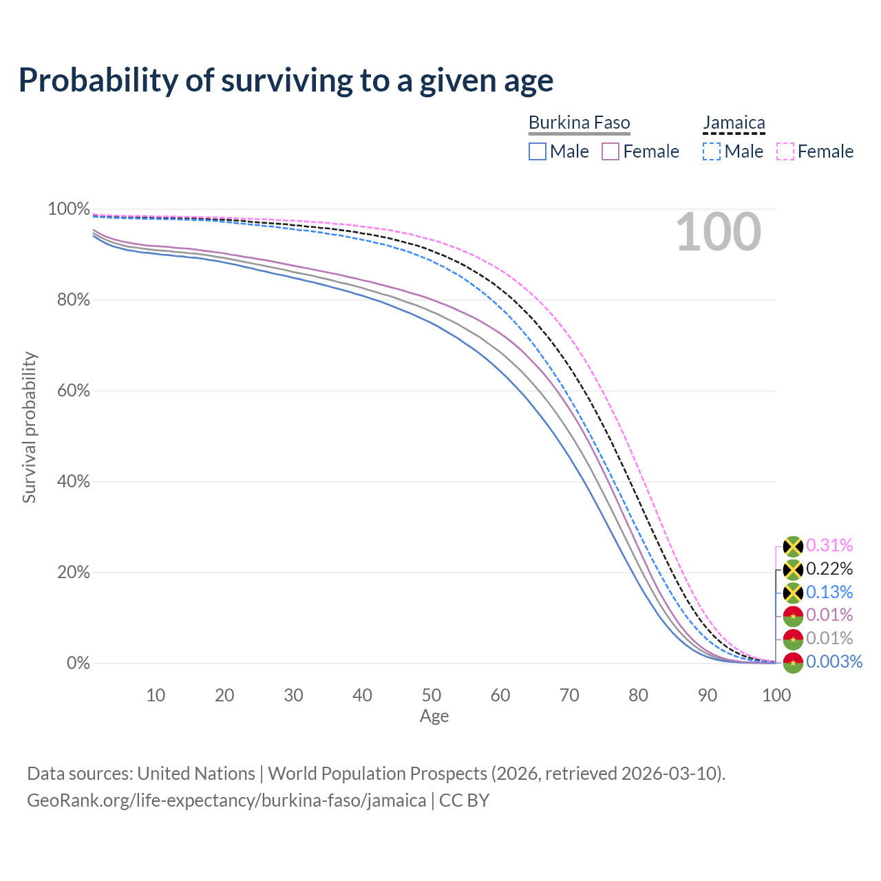 This life expectancy calculator shows the odds of living to 100, 95, 90, and below based on current age for both males and females in Burkina Faso and Jamaica, along with mean and median age of death. The calculations are based on the 2026 life tables (actuarial tables) from the UN World Population Prospects.