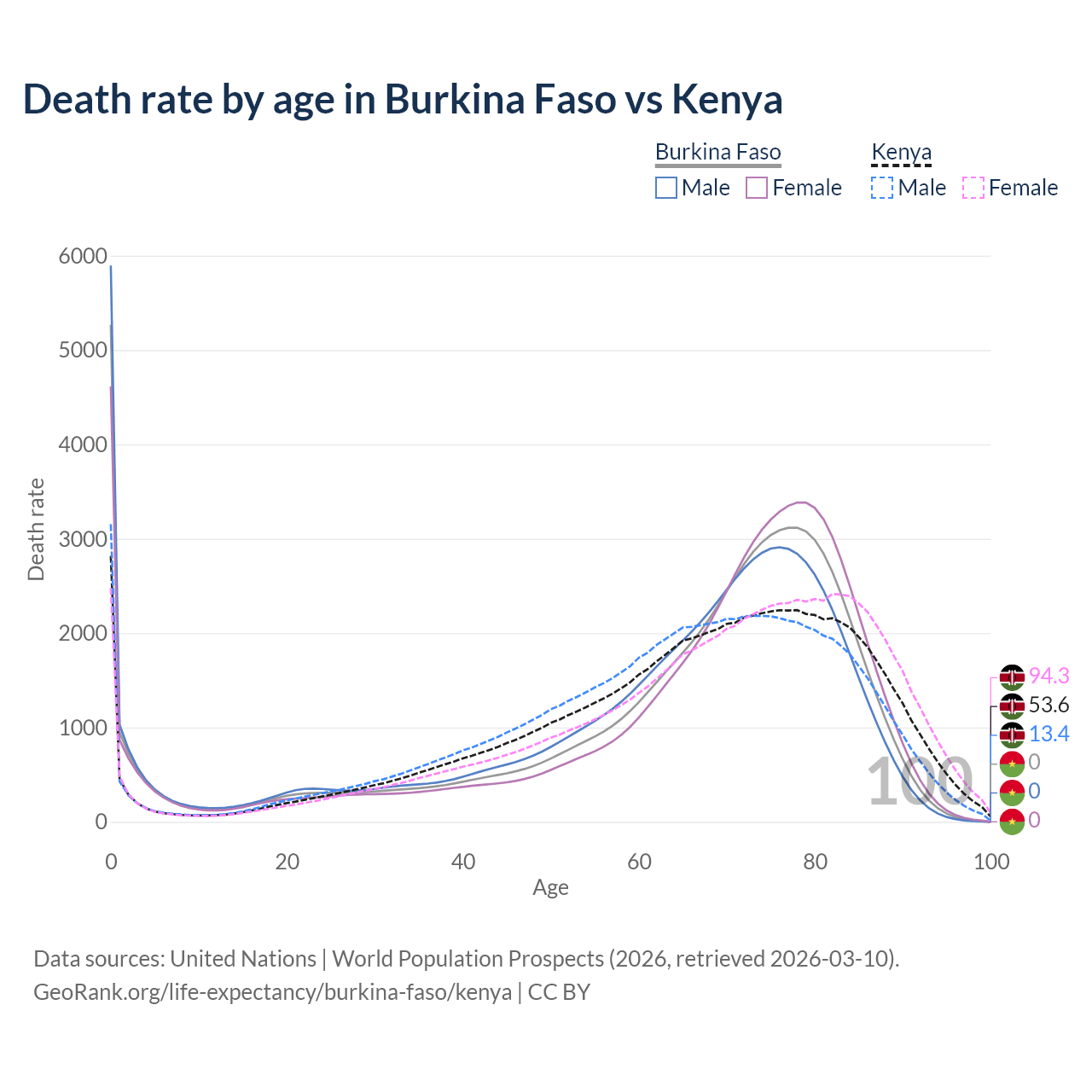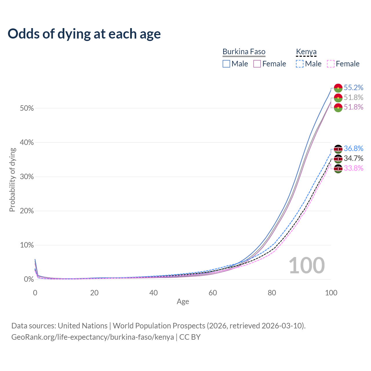 This life expectancy calculator shows the odds of living to 100, 95, 90, and below based on current age for both males and females in Burkina Faso and Kenya, along with mean and median age of death. The calculations are based on the 2026 life tables (actuarial tables) from the UN World Population Prospects.