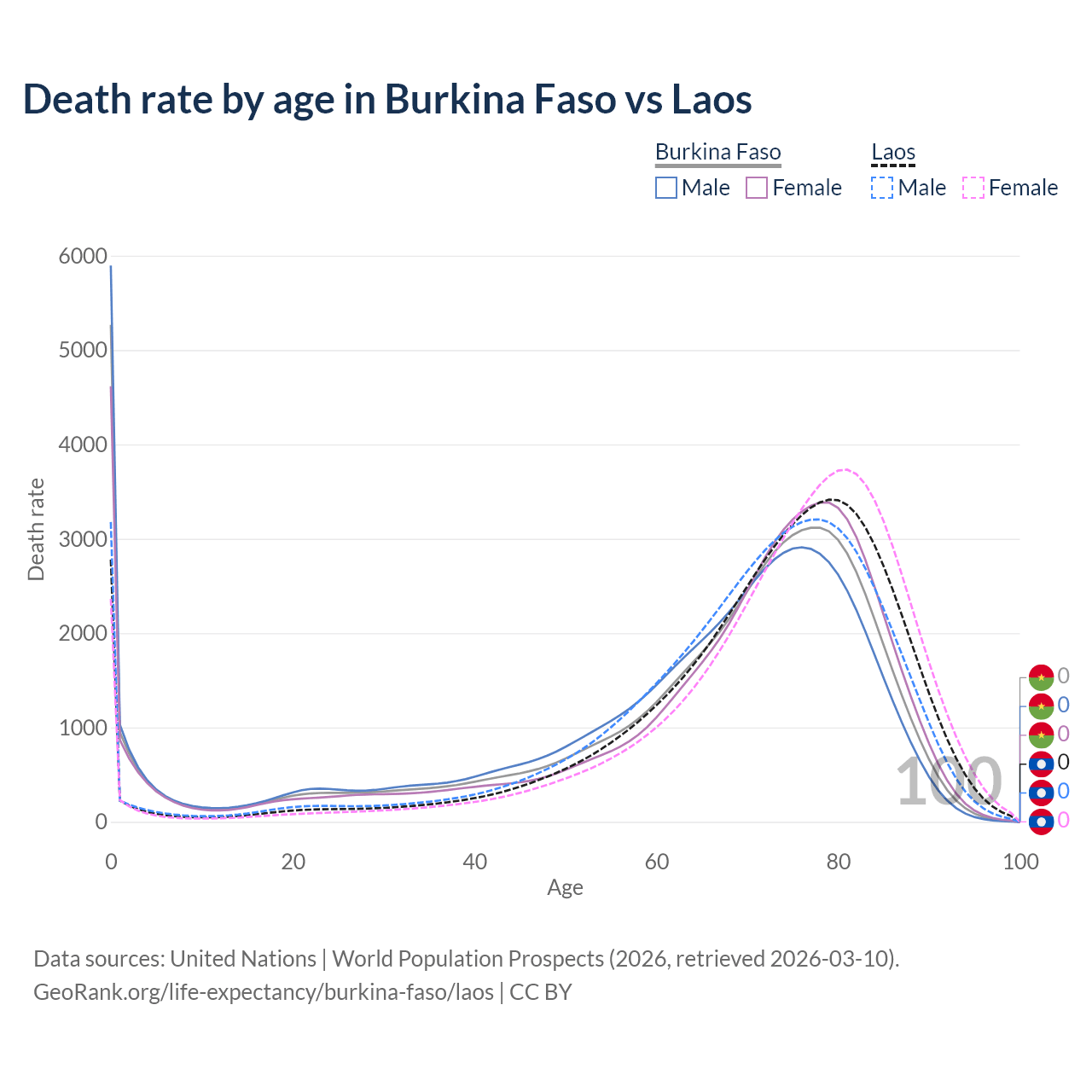 In Burkina Faso, the most common age of death is 0, compared to 79 in Laos. The median age of death is 70.4 in Burkina Faso and 74.7 in Laos, meaning only half of each cohort is expected to live past that age.