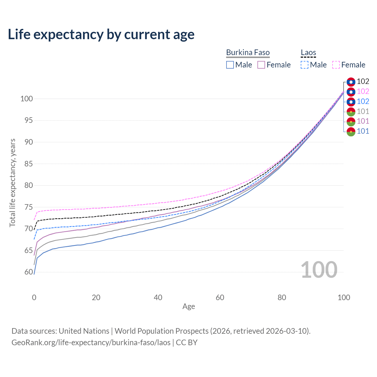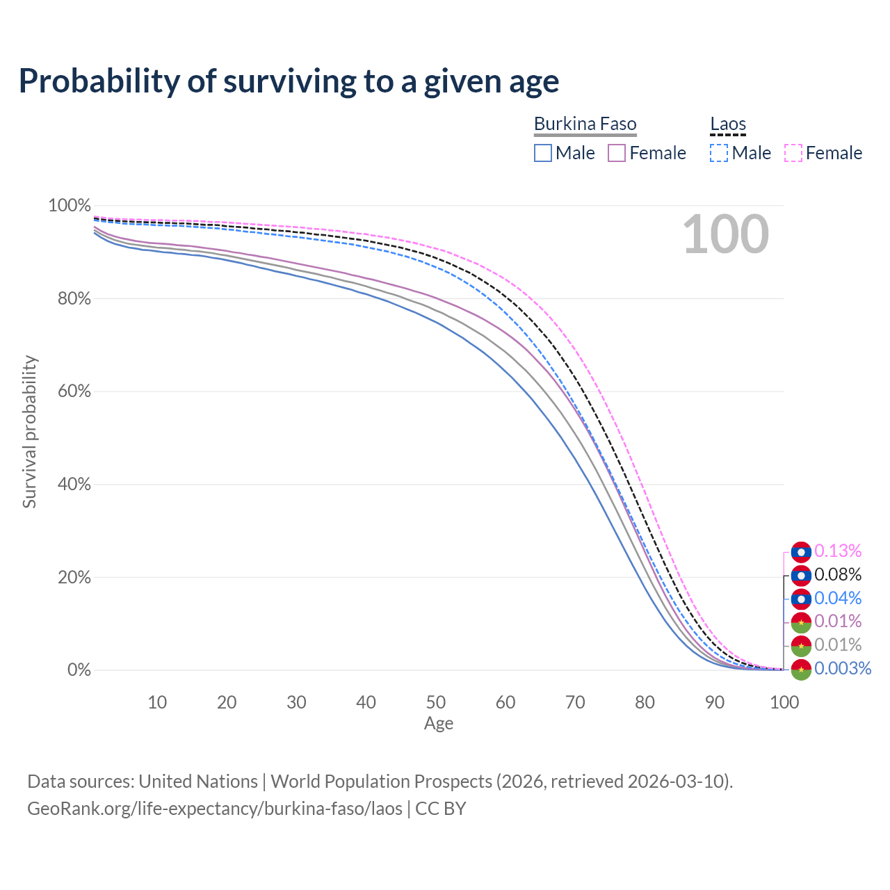 This life expectancy calculator shows the odds of living to 100, 95, 90, and below based on current age for both males and females in Burkina Faso and Laos, along with mean and median age of death. The calculations are based on the 2026 life tables (actuarial tables) from the UN World Population Prospects.