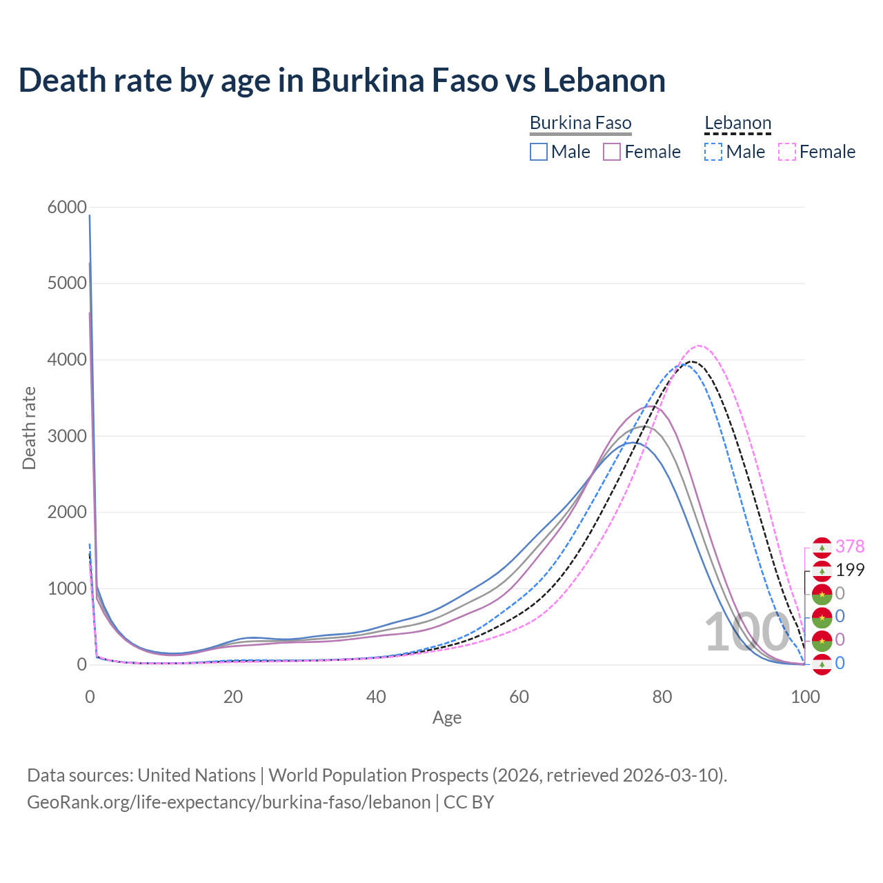 In Burkina Faso, the most common age of death is 0, compared to 84 in Lebanon. The median age of death is 70.4 in Burkina Faso and 81.6 in Lebanon, meaning only half of each cohort is expected to live past that age.