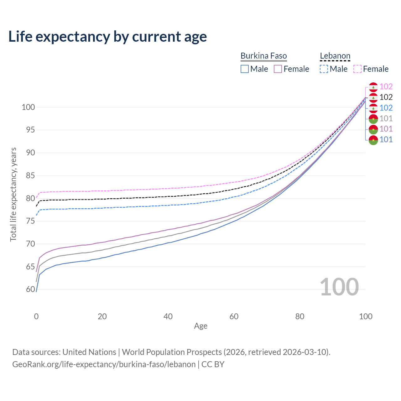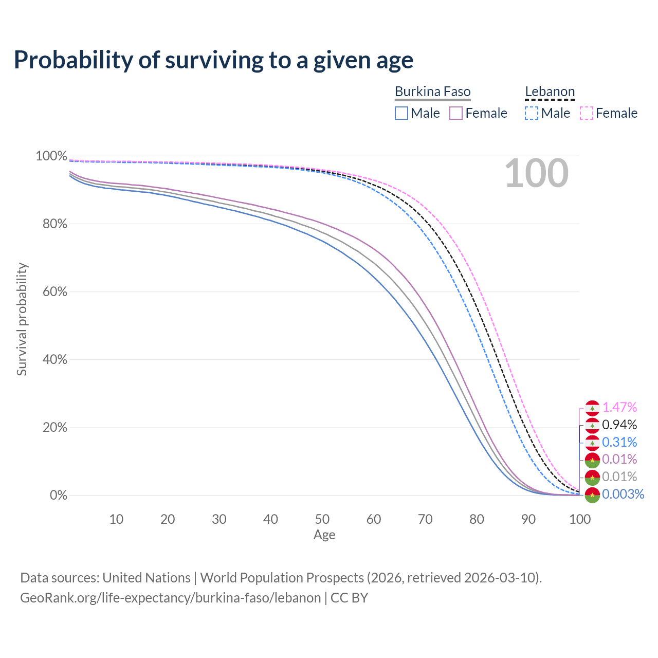 This life expectancy calculator shows the odds of living to 100, 95, 90, and below based on current age for both males and females in Burkina Faso and Lebanon, along with mean and median age of death. The calculations are based on the 2026 life tables (actuarial tables) from the UN World Population Prospects.