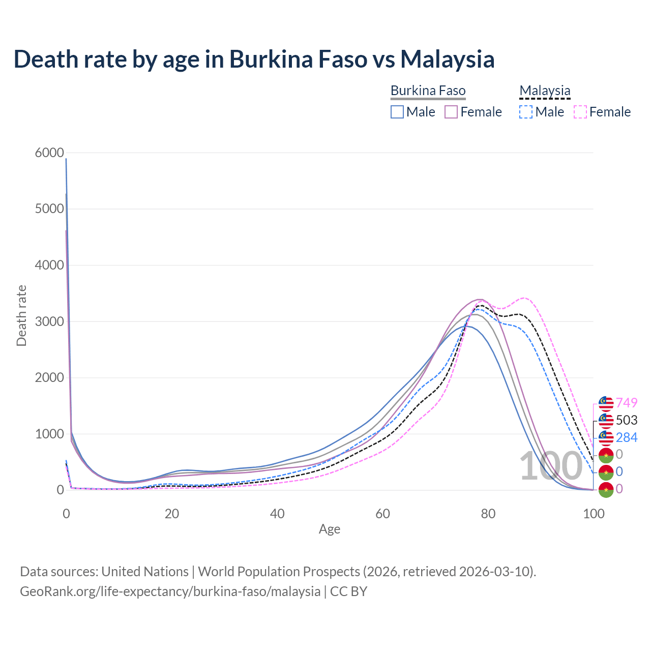 In Burkina Faso, the most common age of death is 0, compared to 79 in Malaysia. The median age of death is 70.4 in Burkina Faso and 79.8 in Malaysia, meaning only half of each cohort is expected to live past that age.