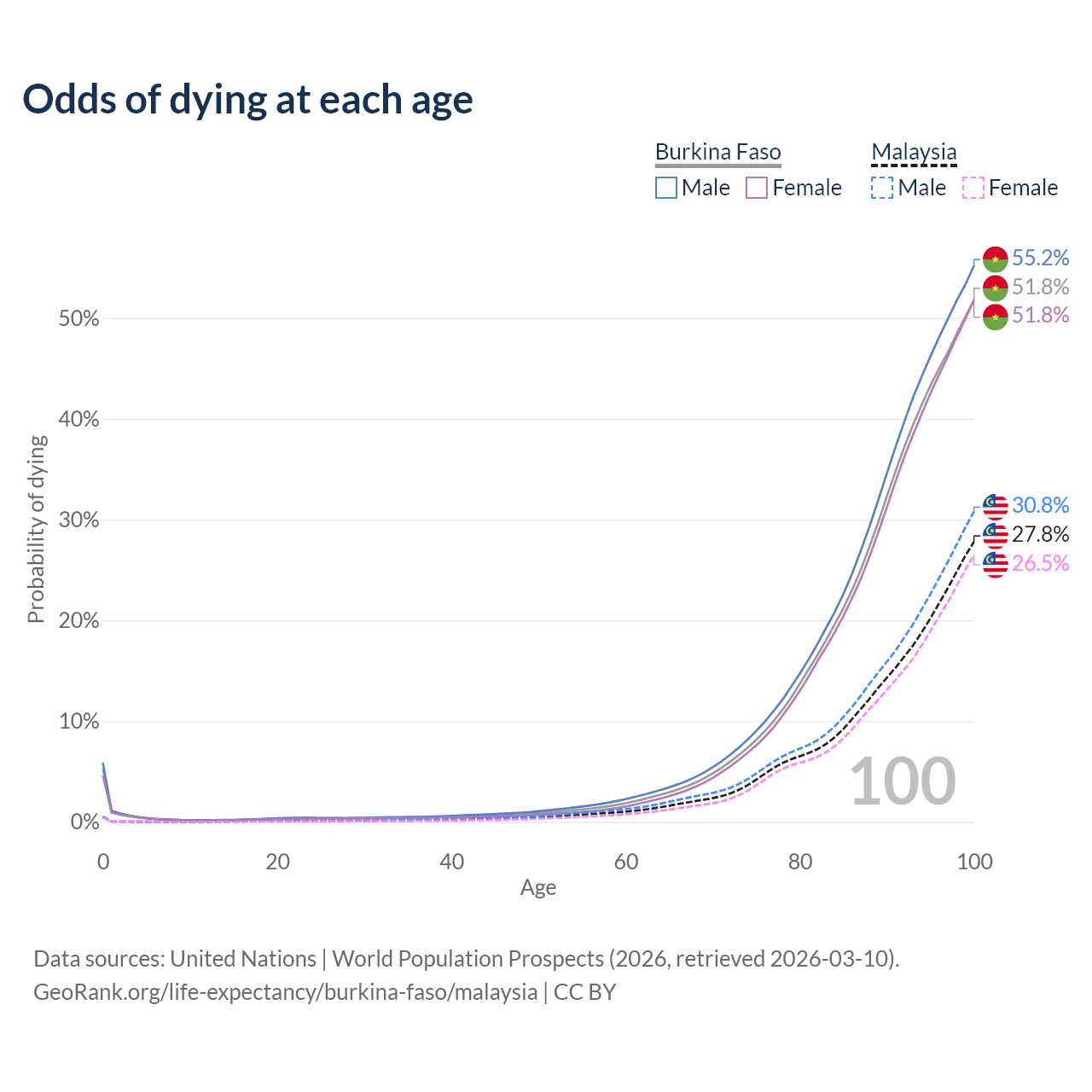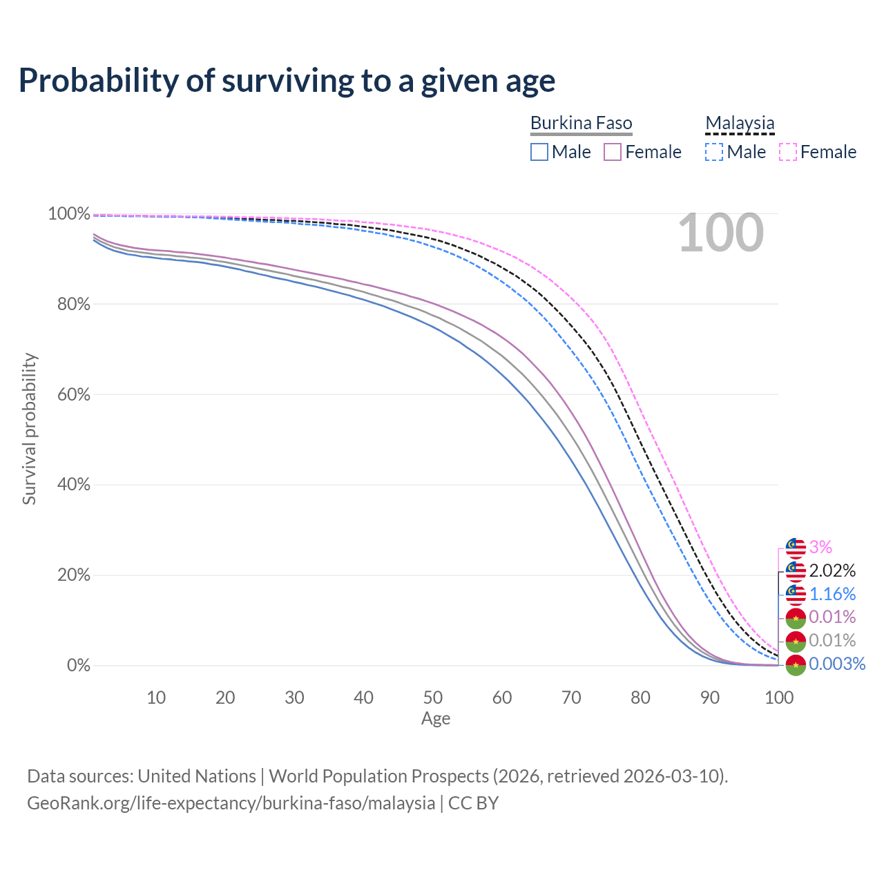 This life expectancy calculator shows the odds of living to 100, 95, 90, and below based on current age for both males and females in Burkina Faso and Malaysia, along with mean and median age of death. The calculations are based on the 2026 life tables (actuarial tables) from the UN World Population Prospects.