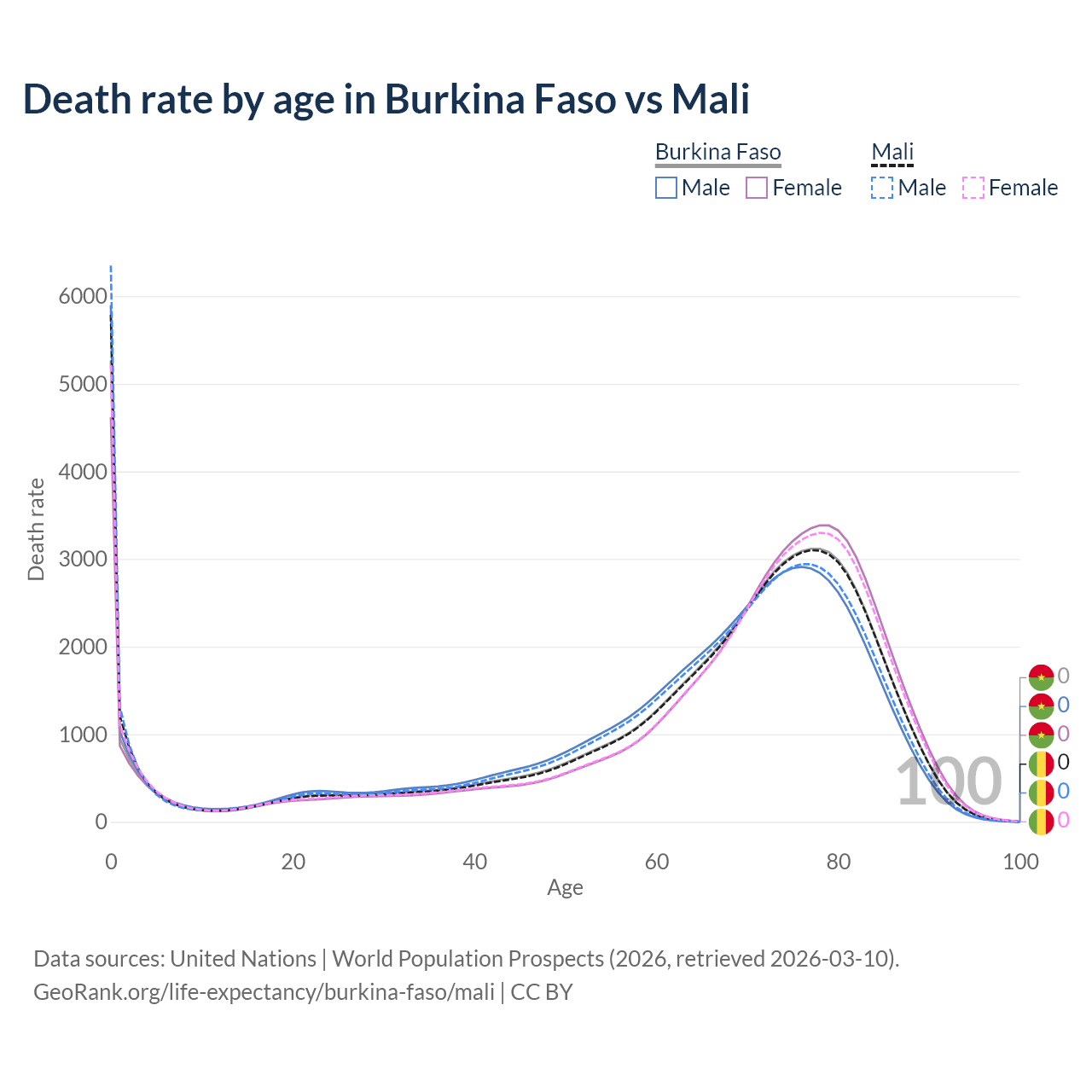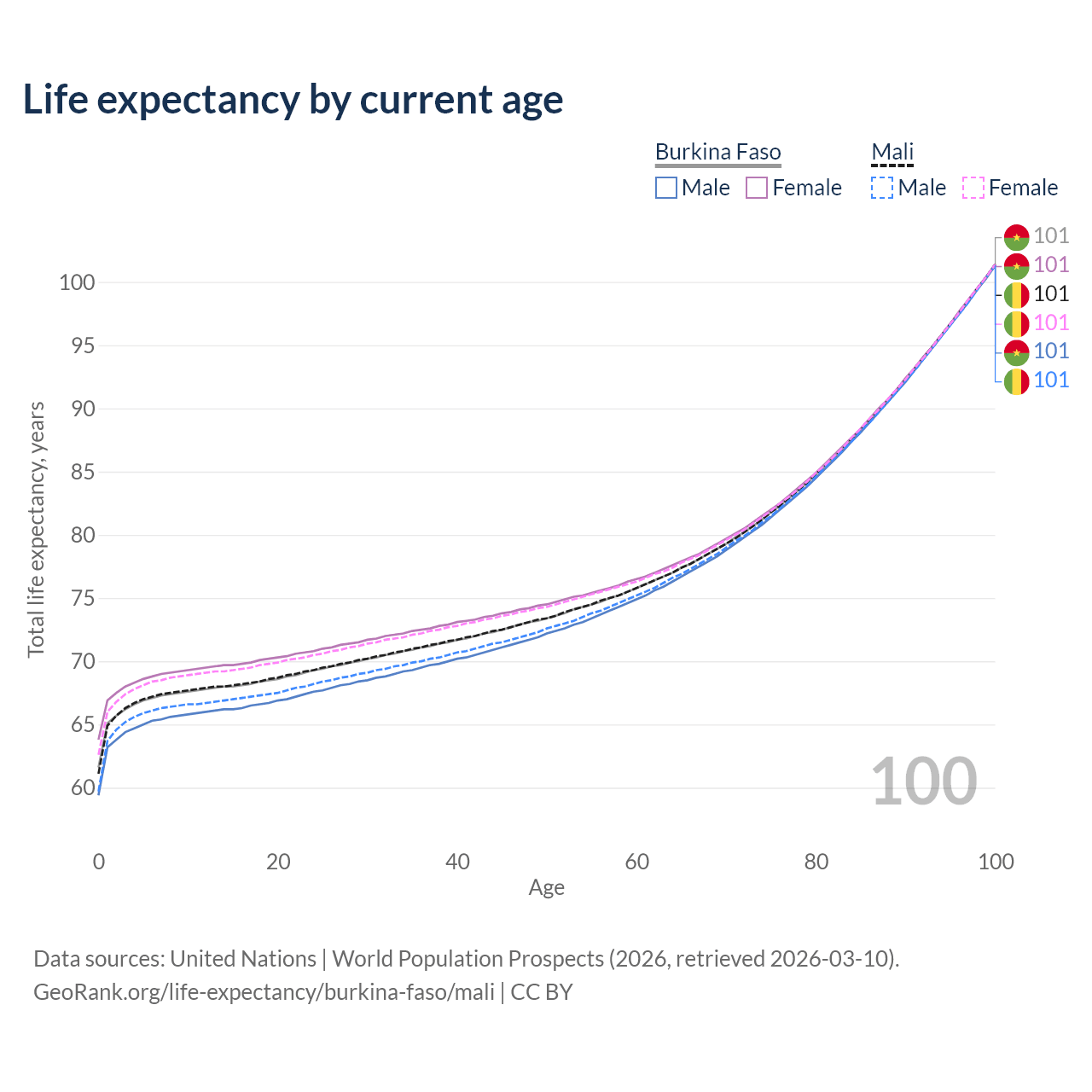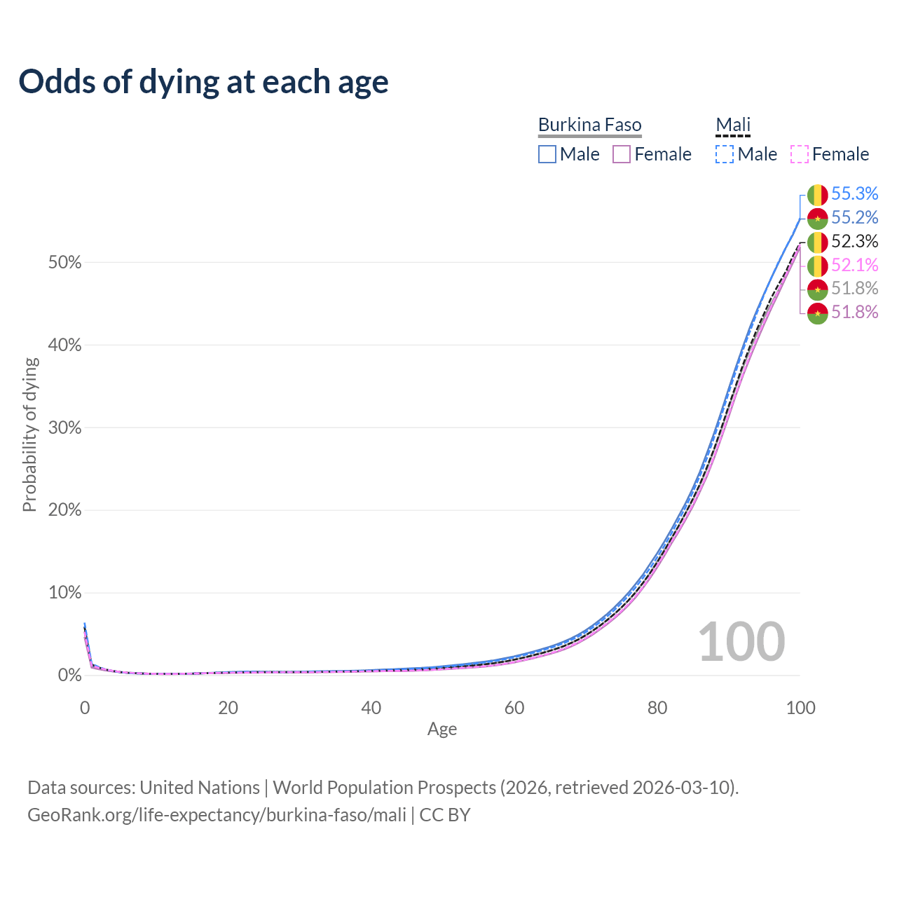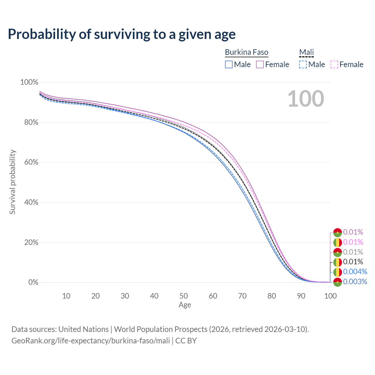 This life expectancy calculator shows the odds of living to 100, 95, 90, and below based on current age for both males and females in Burkina Faso and Mali, along with mean and median age of death. The calculations are based on the 2026 life tables (actuarial tables) from the UN World Population Prospects.