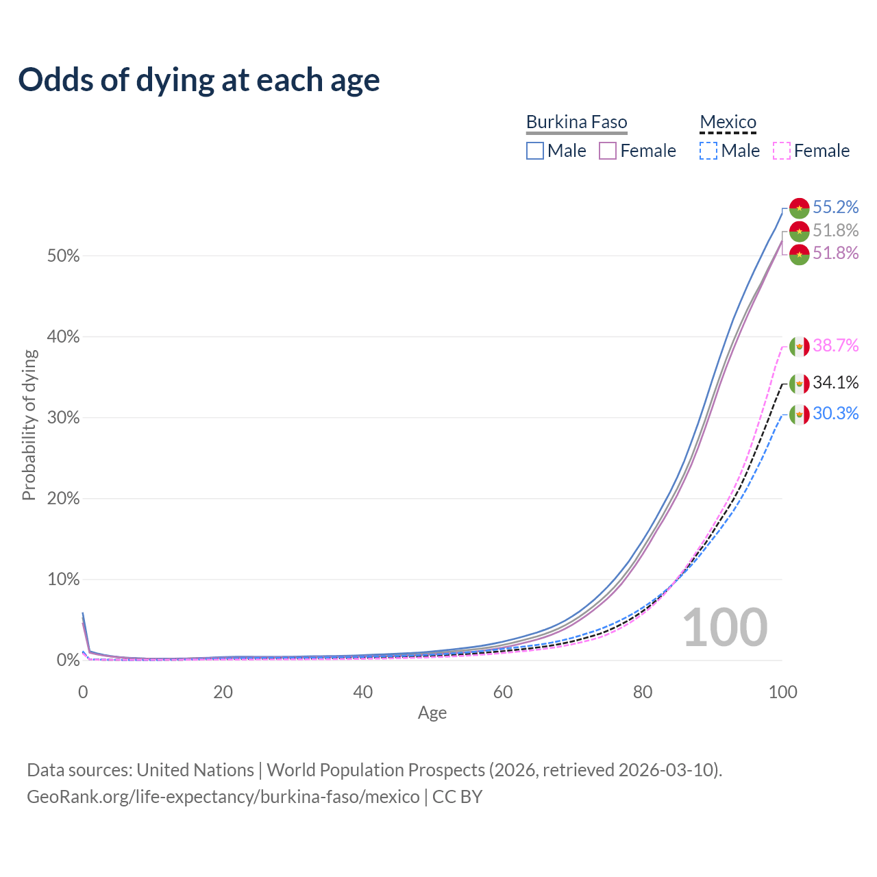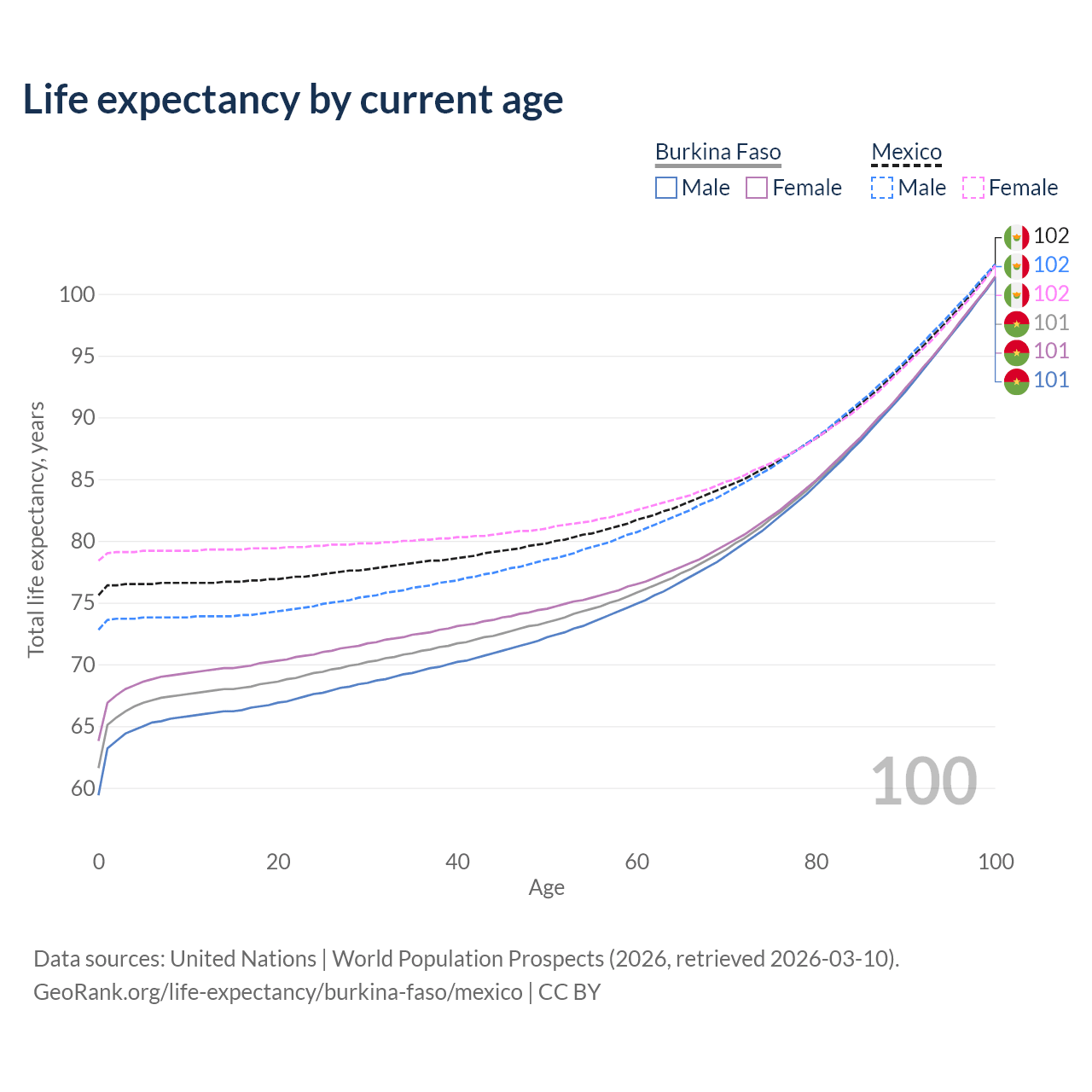This life expectancy calculator shows the odds of living to 100, 95, 90, and below based on current age for both males and females in Burkina Faso and Mexico, along with mean and median age of death. The calculations are based on the 2026 life tables (actuarial tables) from the UN World Population Prospects.