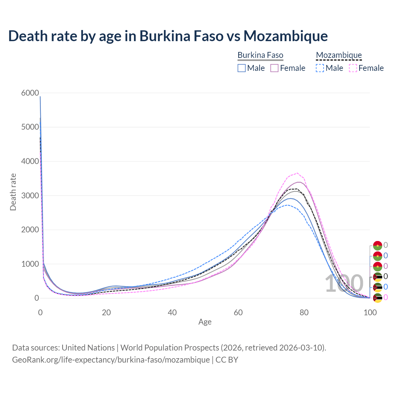 In Burkina Faso, the most common age of death is 0, compared to 0 in Mozambique. The median age of death is 70.4 in Burkina Faso and 71.2 in Mozambique, meaning only half of each cohort is expected to live past that age.