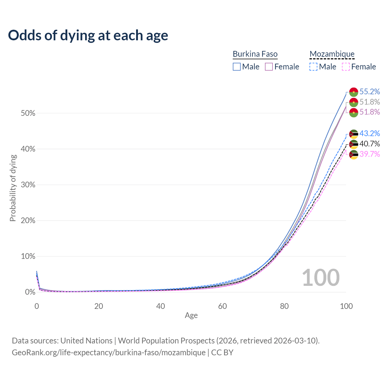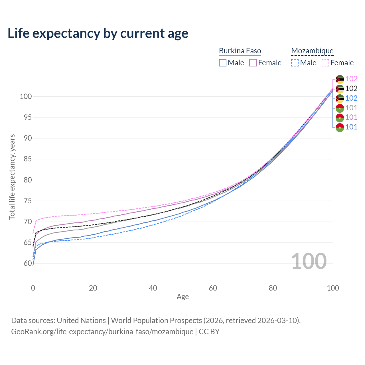This life expectancy calculator shows the odds of living to 100, 95, 90, and below based on current age for both males and females in Burkina Faso and Mozambique, along with mean and median age of death. The calculations are based on the 2026 life tables (actuarial tables) from the UN World Population Prospects.