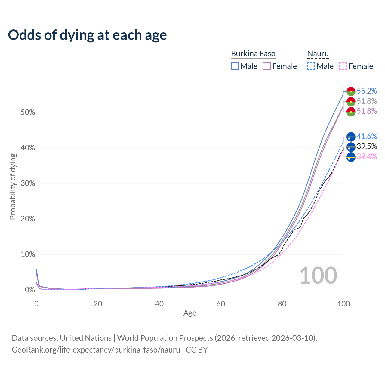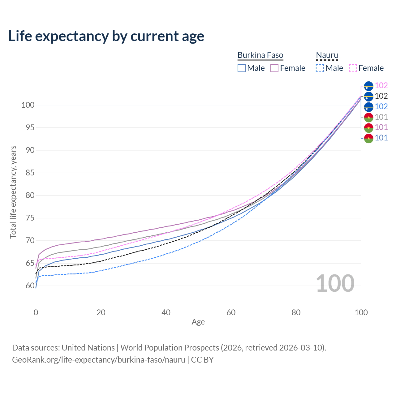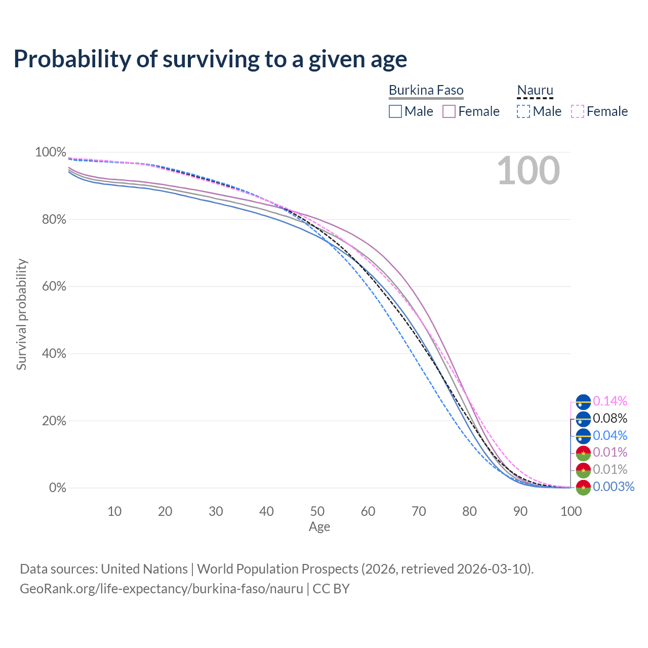 This life expectancy calculator shows the odds of living to 100, 95, 90, and below based on current age for both males and females in Burkina Faso and Nauru, along with mean and median age of death. The calculations are based on the 2026 life tables (actuarial tables) from the UN World Population Prospects.