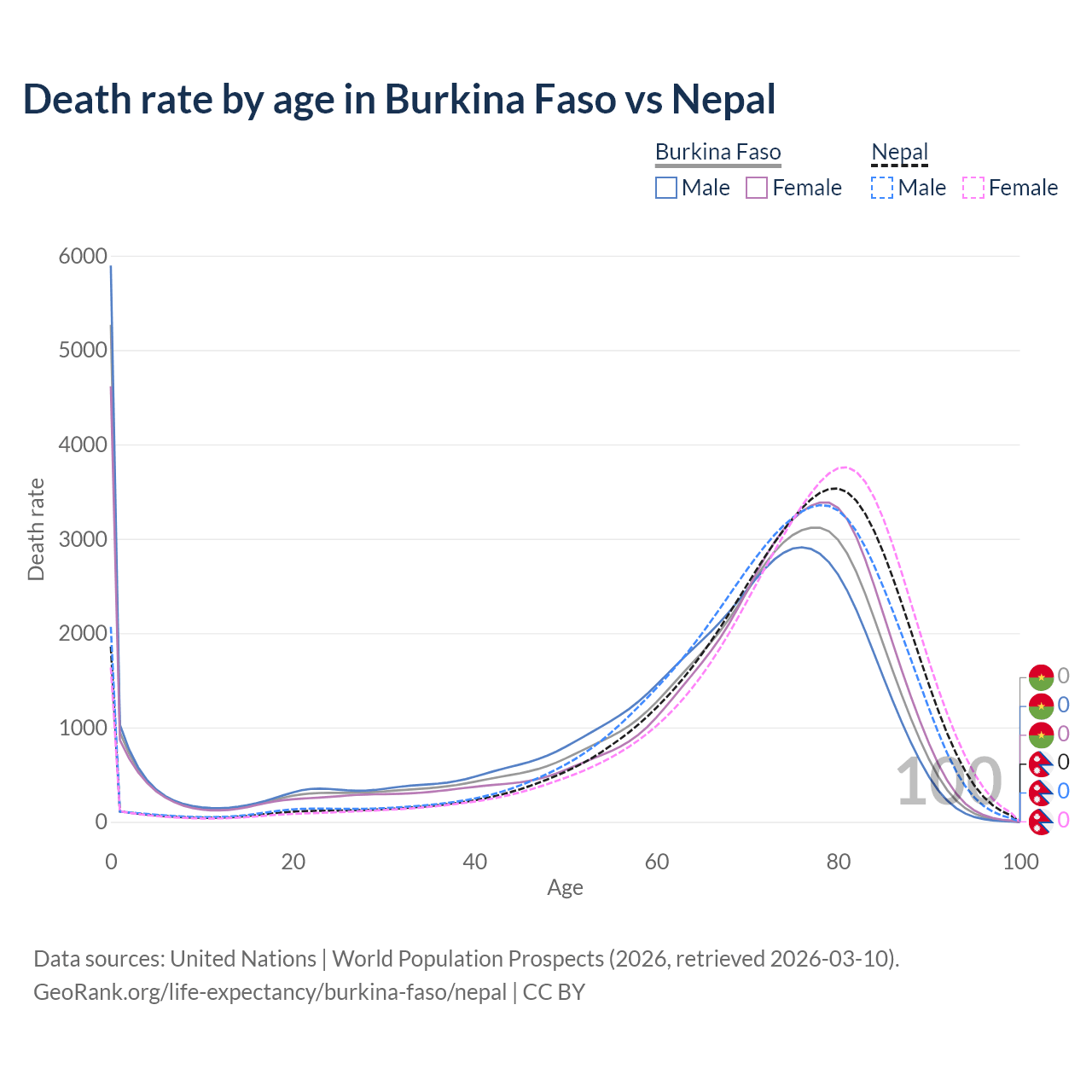In Burkina Faso, the most common age of death is 0, compared to 80 in Nepal. The median age of death is 70.4 in Burkina Faso and 75.4 in Nepal, meaning only half of each cohort is expected to live past that age.