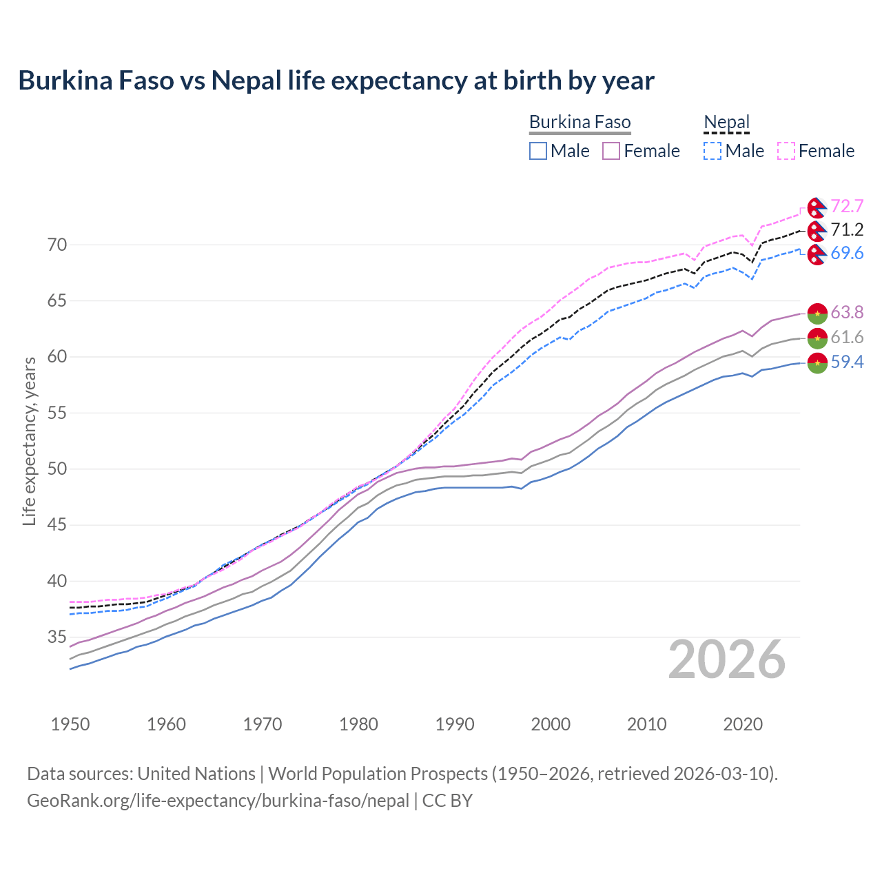 The average life expectancy at birth is 61.6 years in Burkina Faso vs 71.2 in Nepal. Burkina Faso is ranked 188/197 by life expectancy, and Nepal is 131/197. In Burkina Faso, the life expectancy is 59.4 years for males and 63.8 years for females. In Nepal, it's 69.6 years for males and 72.7 years for females.
