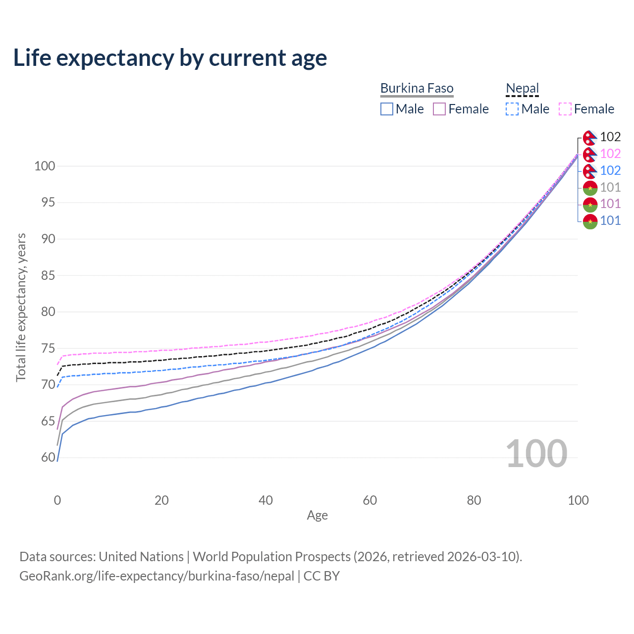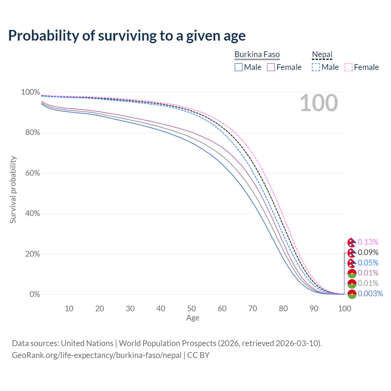 This life expectancy calculator shows the odds of living to 100, 95, 90, and below based on current age for both males and females in Burkina Faso and Nepal, along with mean and median age of death. The calculations are based on the 2026 life tables (actuarial tables) from the UN World Population Prospects.