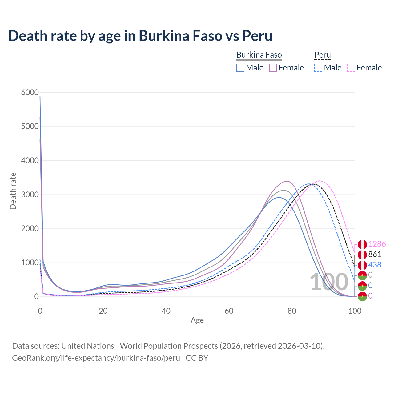 In Burkina Faso, the most common age of death is 0, compared to 87 in Peru. The median age of death is 70.4 in Burkina Faso and 82.4 in Peru, meaning only half of each cohort is expected to live past that age.