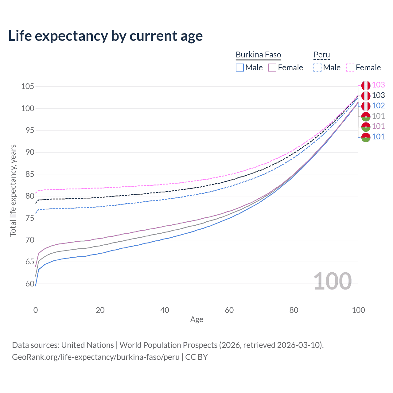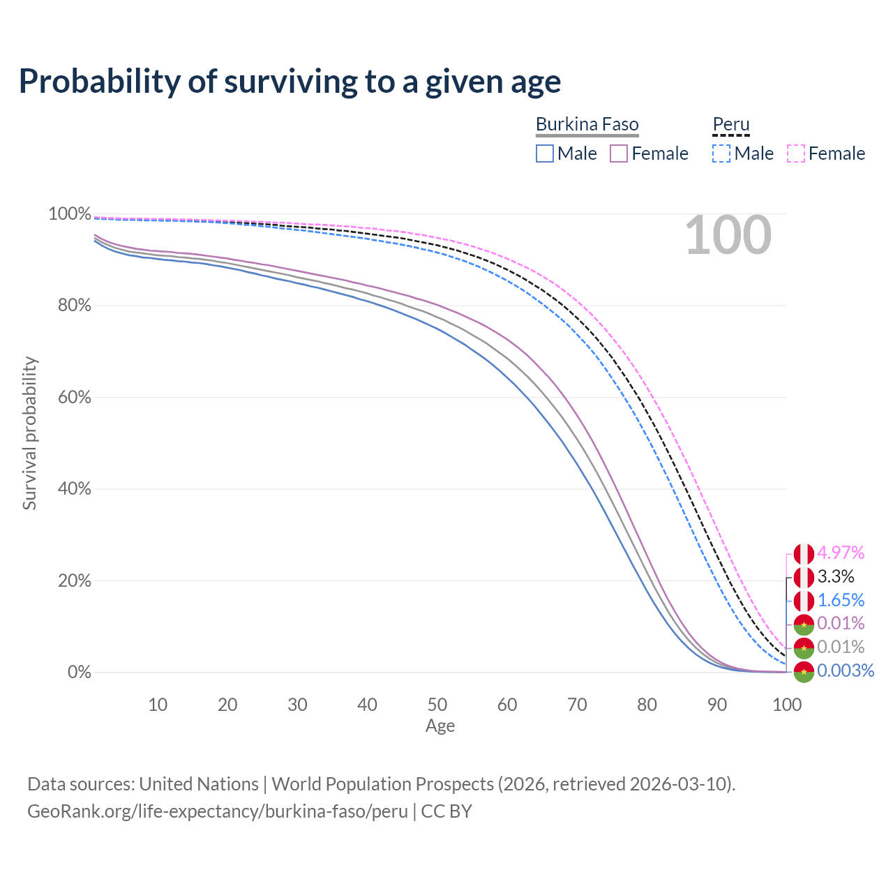 This life expectancy calculator shows the odds of living to 100, 95, 90, and below based on current age for both males and females in Burkina Faso and Peru, along with mean and median age of death. The calculations are based on the 2026 life tables (actuarial tables) from the UN World Population Prospects.