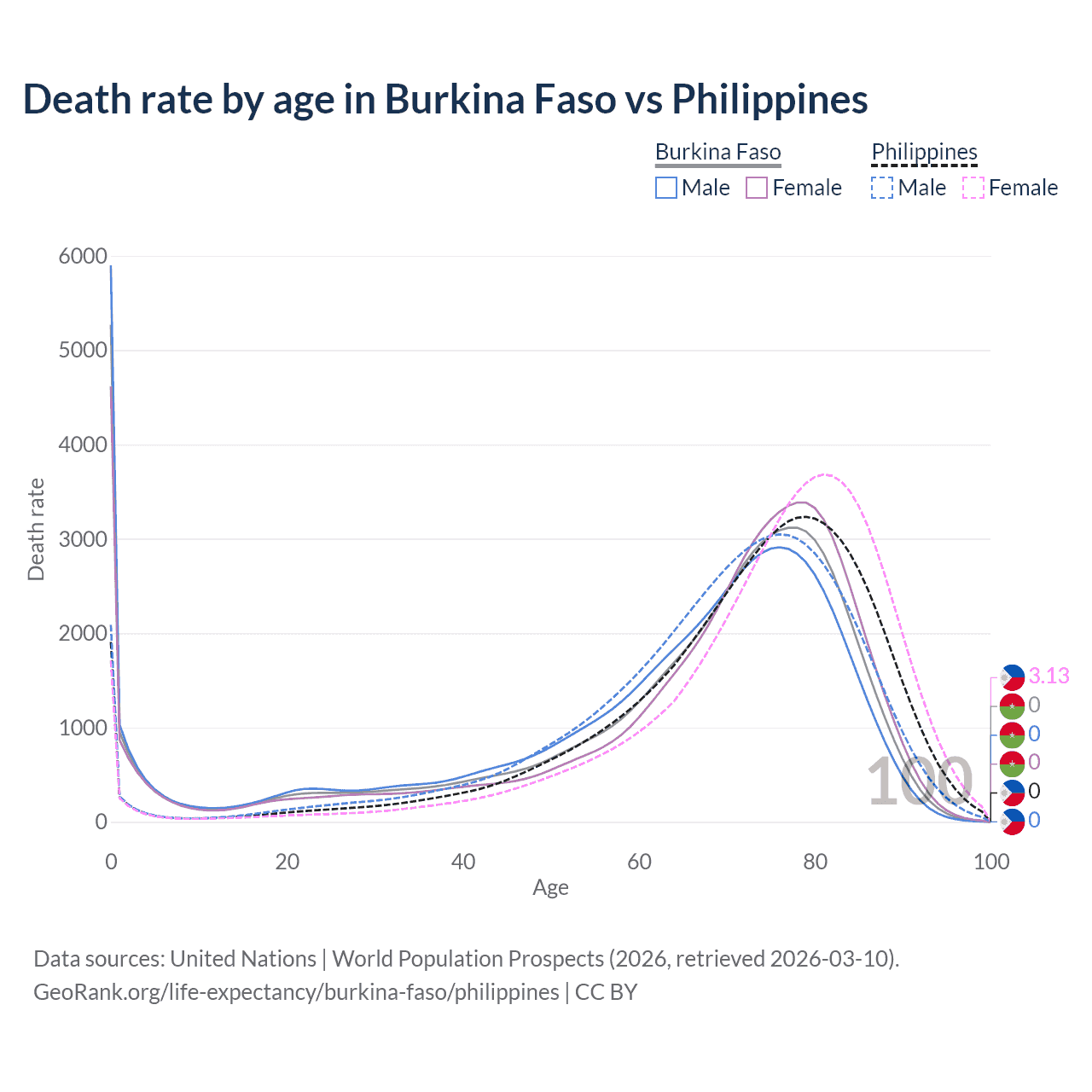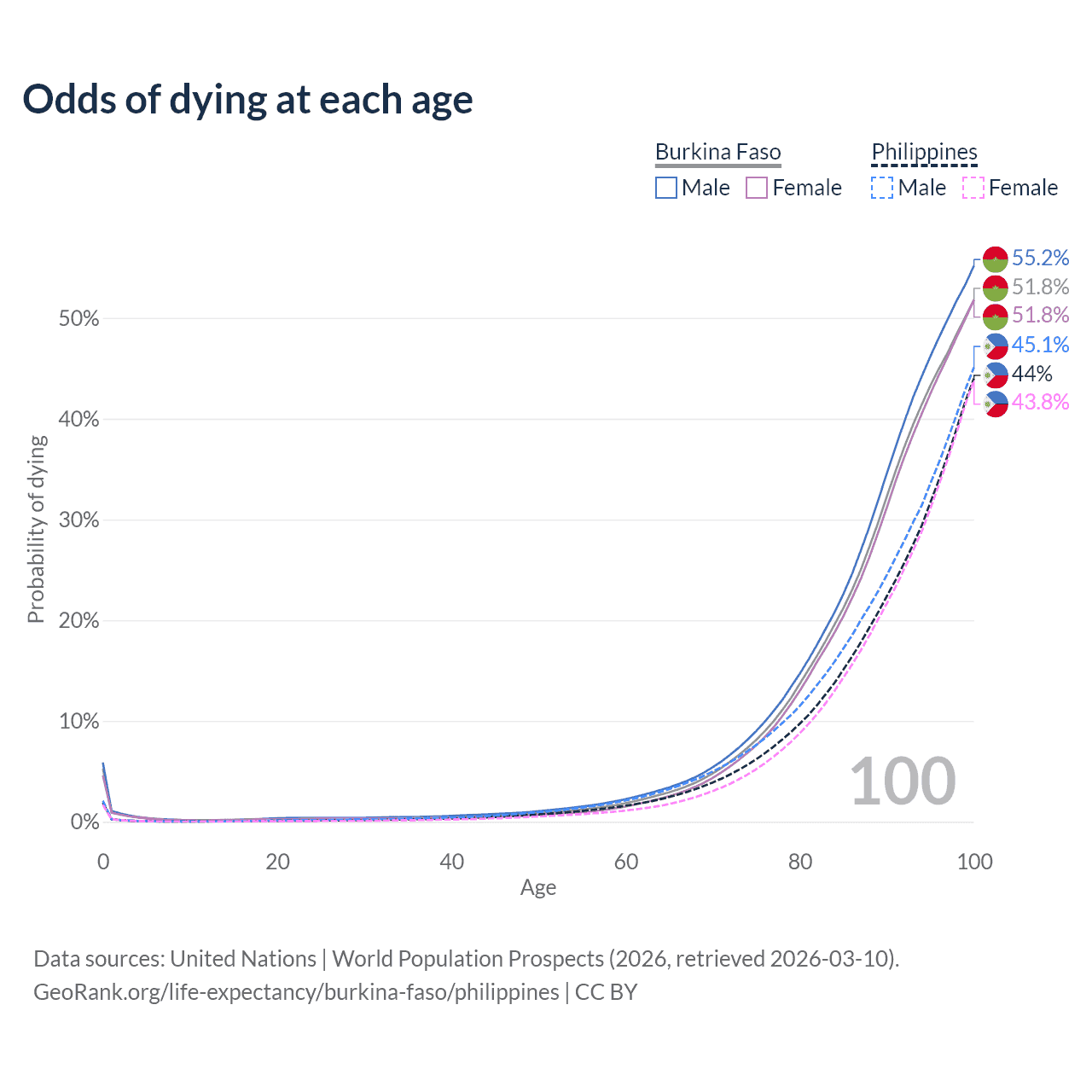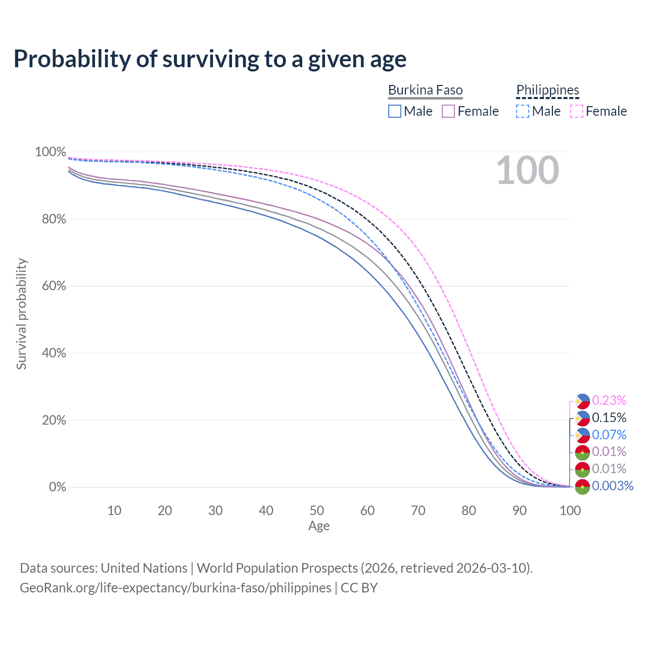 This life expectancy calculator shows the odds of living to 100, 95, 90, and below based on current age for both males and females in Burkina Faso and the Philippines, along with mean and median age of death. The calculations are based on the 2026 life tables (actuarial tables) from the UN World Population Prospects.