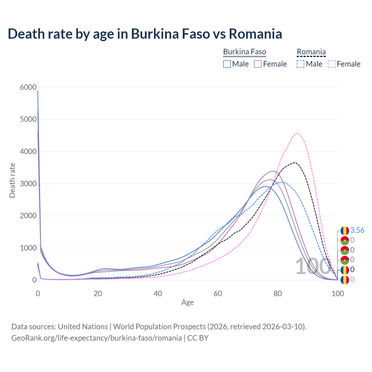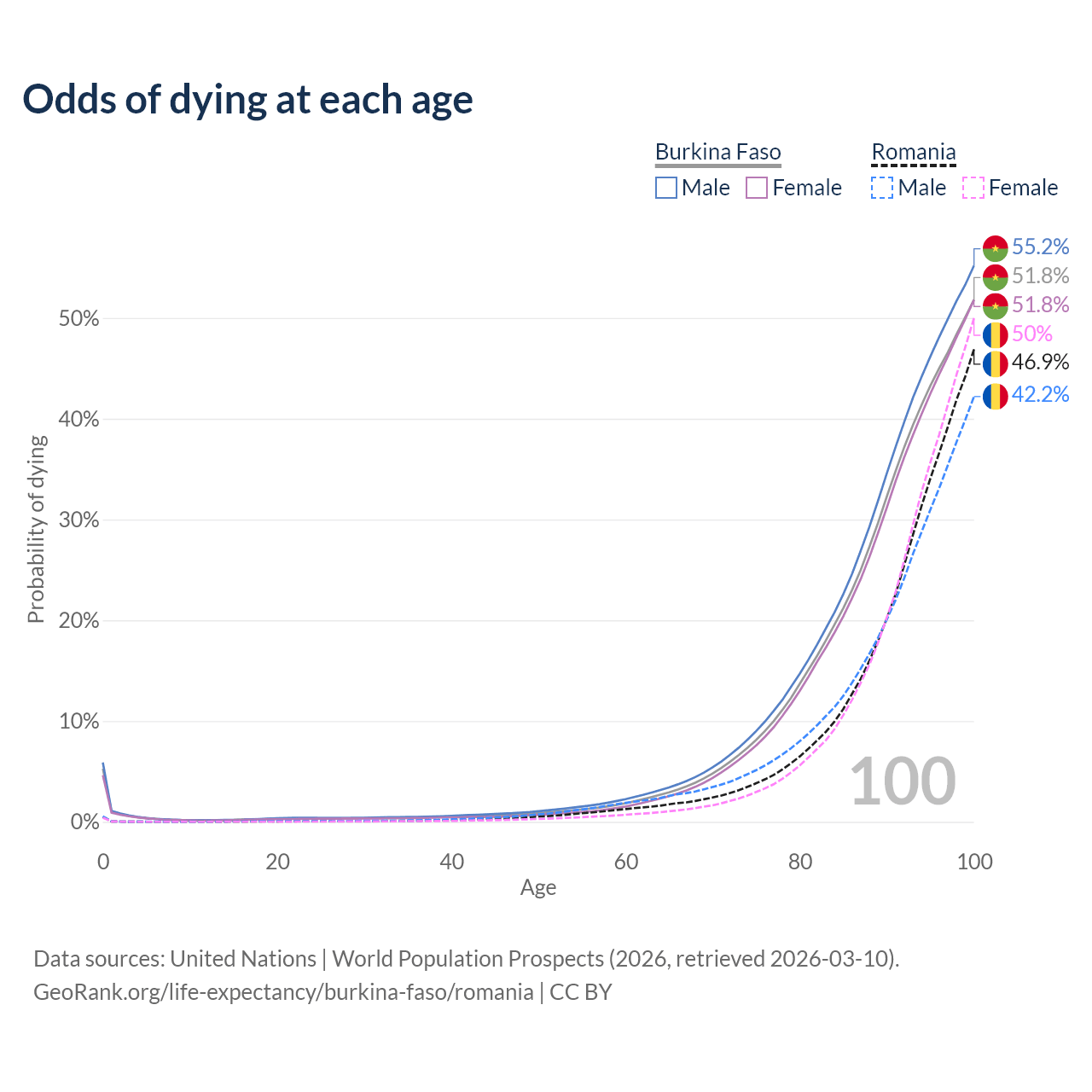 This life expectancy calculator shows the odds of living to 100, 95, 90, and below based on current age for both males and females in Burkina Faso and Romania, along with mean and median age of death. The calculations are based on the 2026 life tables (actuarial tables) from the UN World Population Prospects.