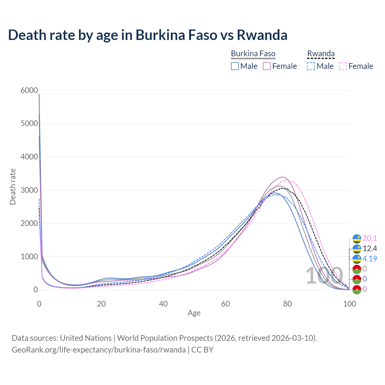 In Burkina Faso, the most common age of death is 0, compared to 78 in Rwanda. The median age of death is 70.4 in Burkina Faso and 73.5 in Rwanda, meaning only half of each cohort is expected to live past that age.