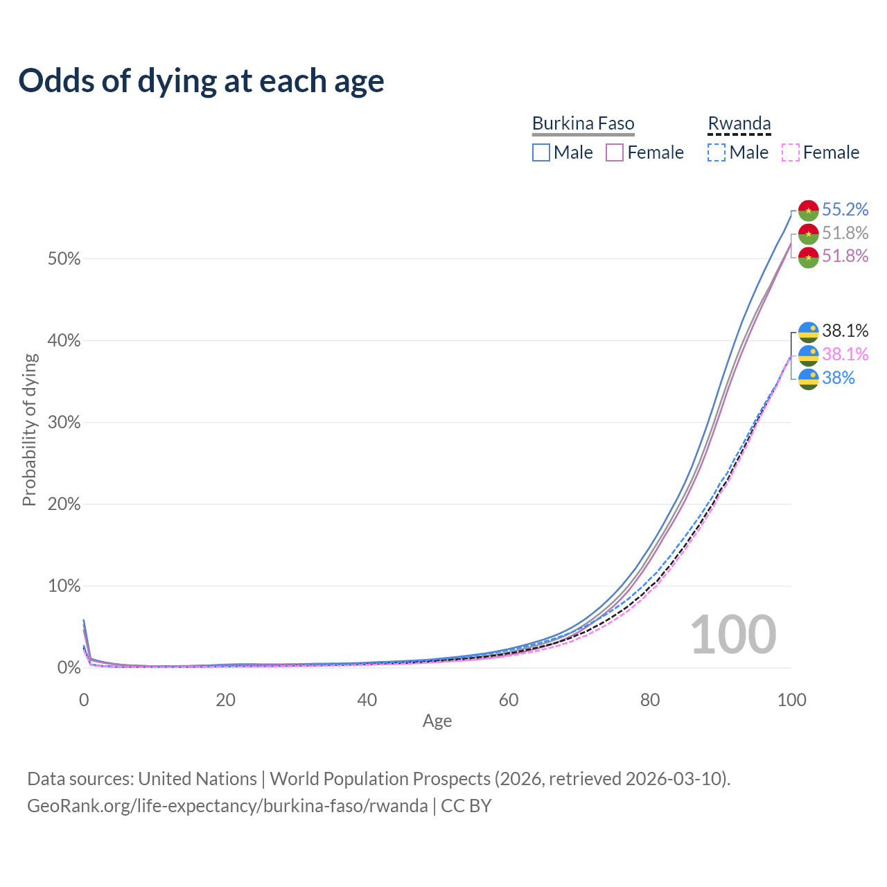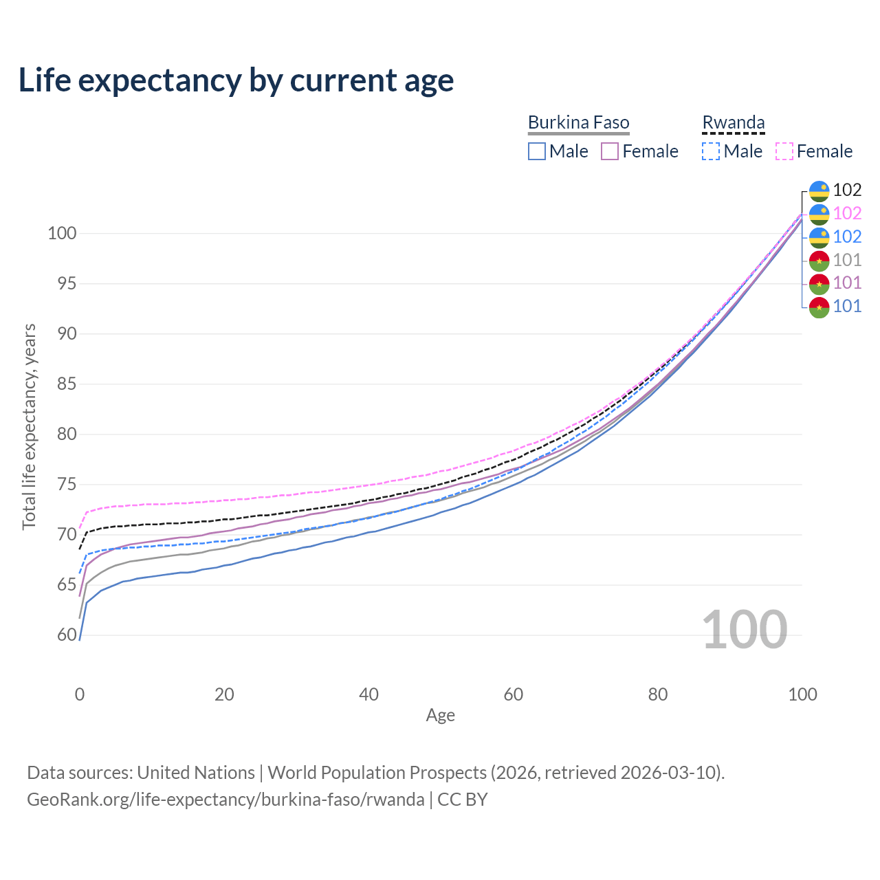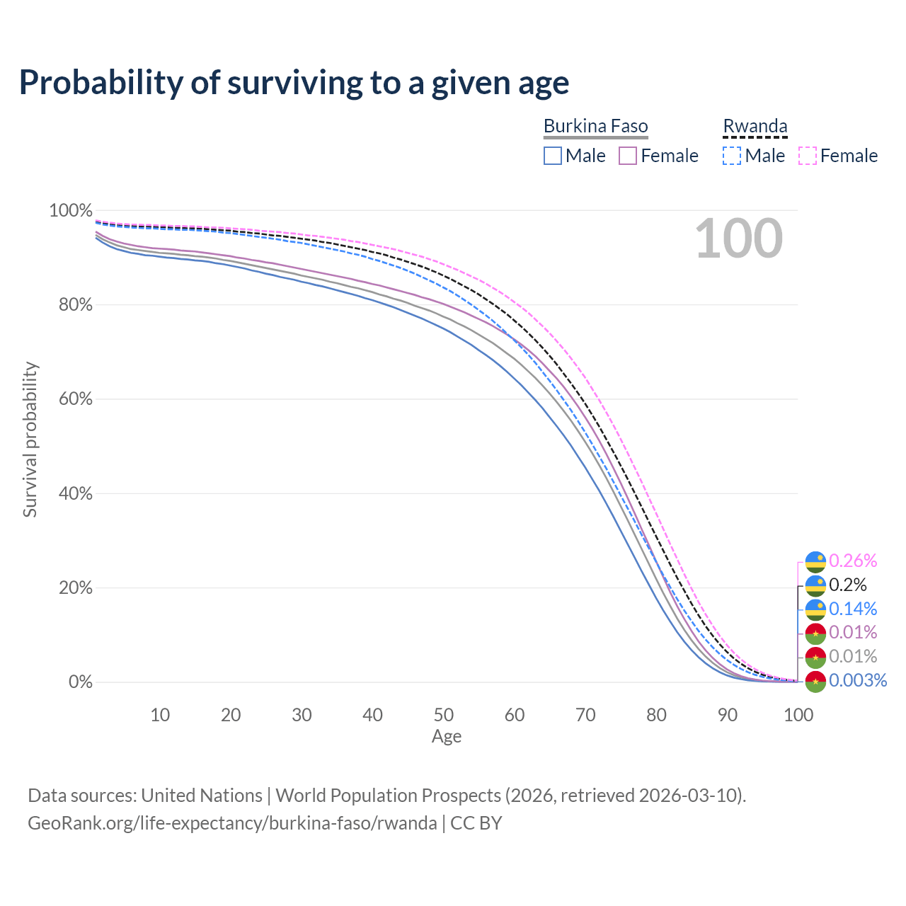 This life expectancy calculator shows the odds of living to 100, 95, 90, and below based on current age for both males and females in Burkina Faso and Rwanda, along with mean and median age of death. The calculations are based on the 2026 life tables (actuarial tables) from the UN World Population Prospects.