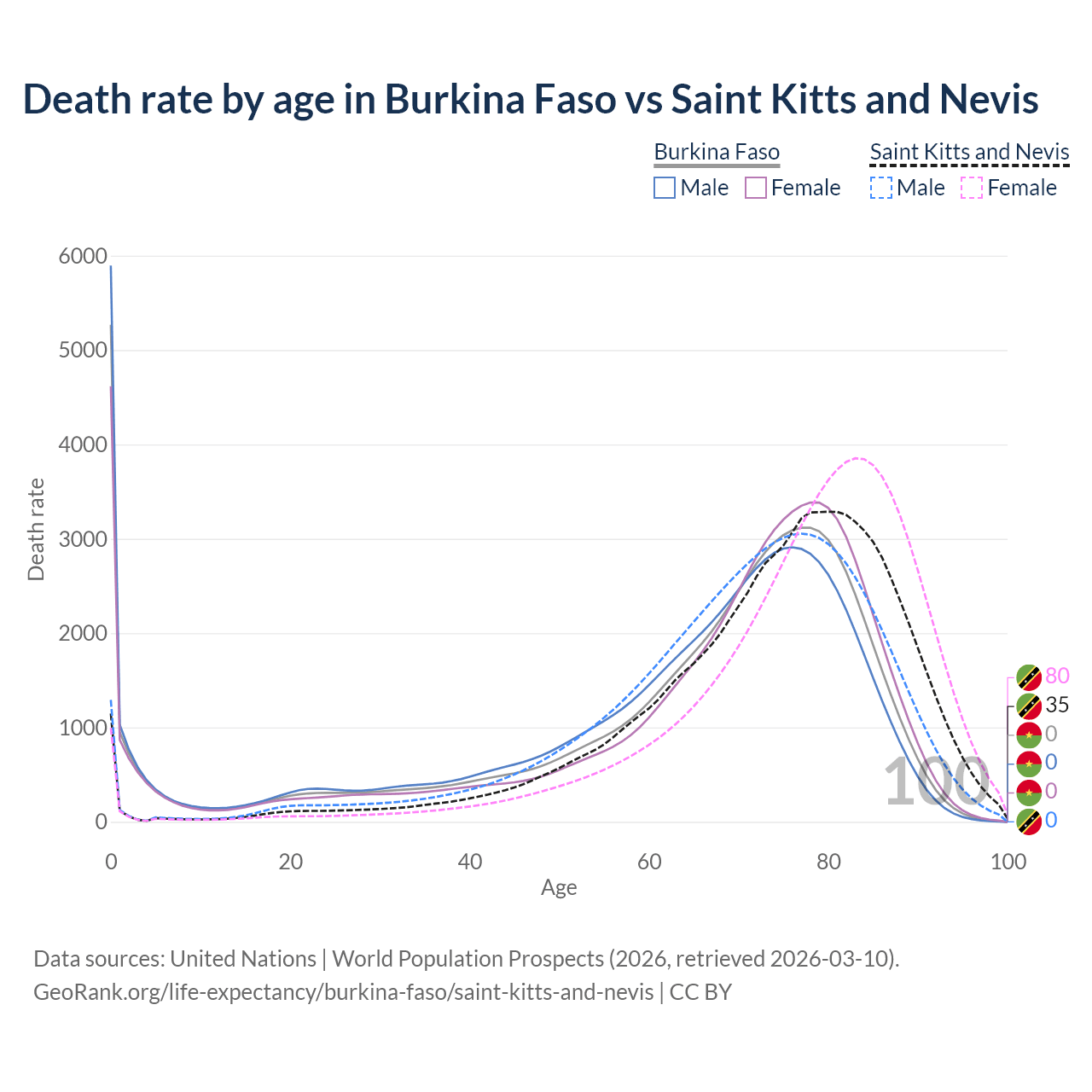 In Burkina Faso, the most common age of death is 0, compared to 80 in Saint Kitts and Nevis. The median age of death is 70.4 in Burkina Faso and 76.3 in Saint Kitts and Nevis, meaning only half of each cohort is expected to live past that age.