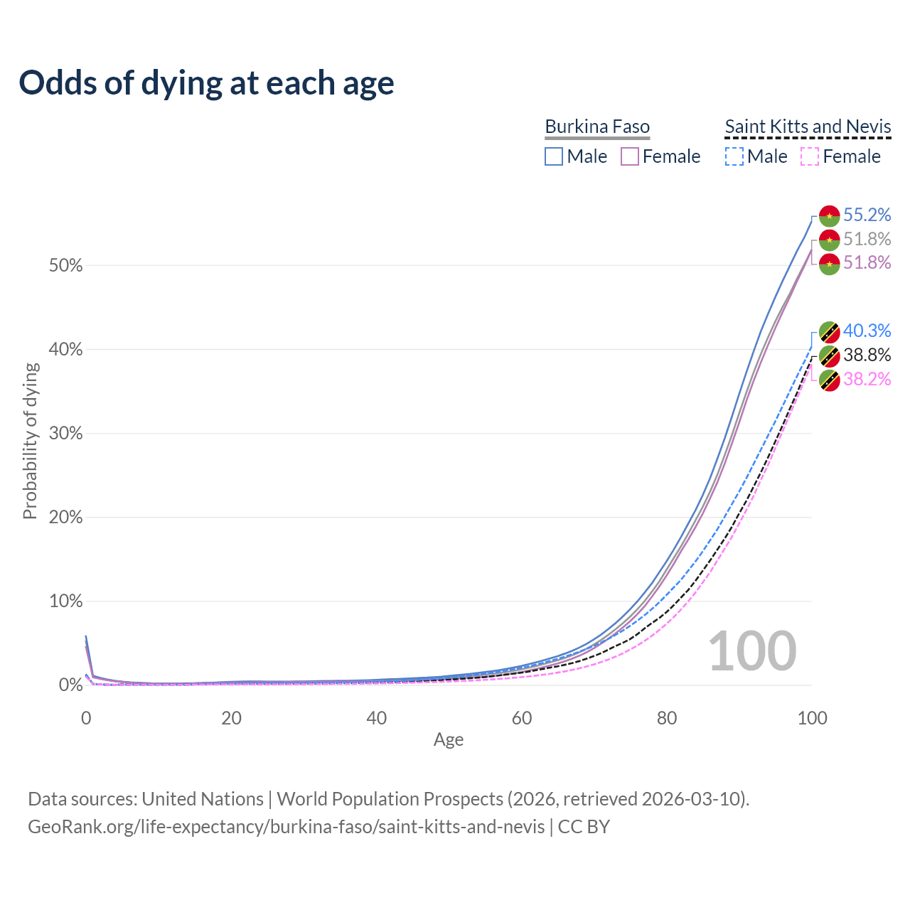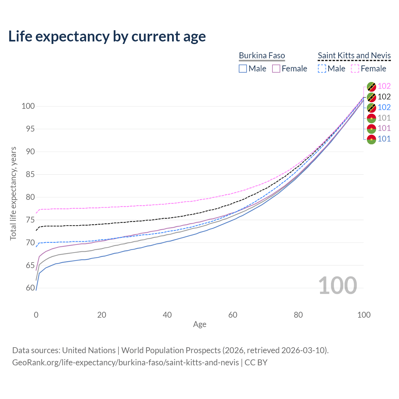 This life expectancy calculator shows the odds of living to 100, 95, 90, and below based on current age for both males and females in Burkina Faso and Saint Kitts and Nevis, along with mean and median age of death. The calculations are based on the 2026 life tables (actuarial tables) from the UN World Population Prospects.