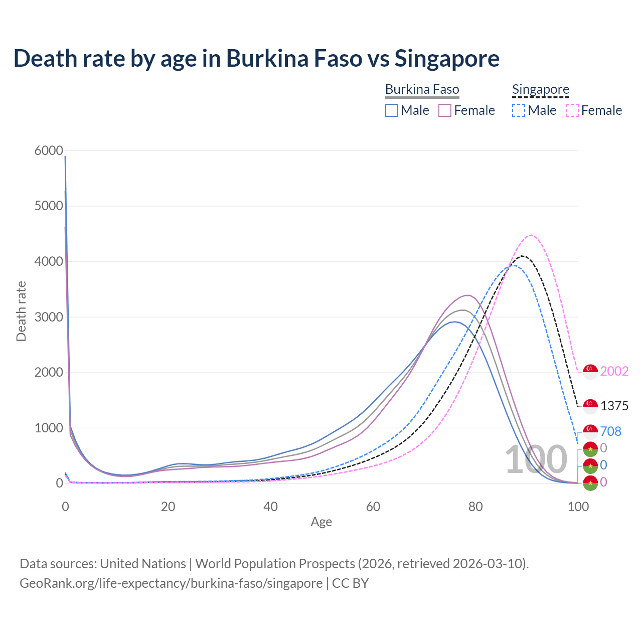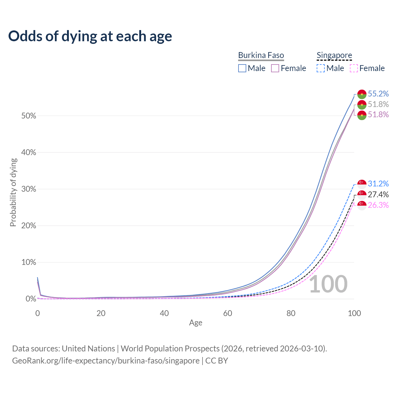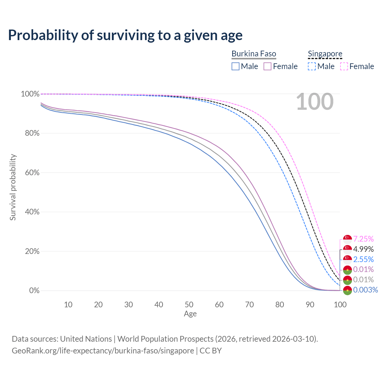 This life expectancy calculator shows the odds of living to 100, 95, 90, and below based on current age for both males and females in Burkina Faso and Singapore, along with mean and median age of death. The calculations are based on the 2026 life tables (actuarial tables) from the UN World Population Prospects.