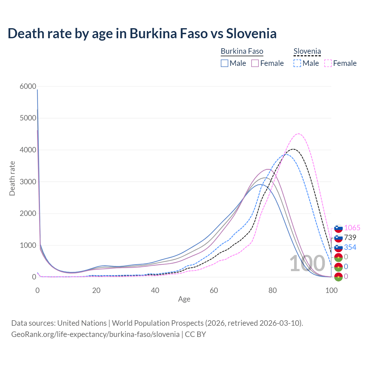 In Burkina Faso, the most common age of death is 0, compared to 87 in Slovenia. The median age of death is 70.4 in Burkina Faso and 84.4 in Slovenia, meaning only half of each cohort is expected to live past that age.