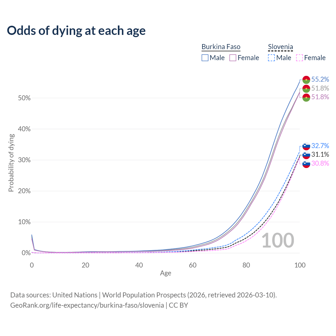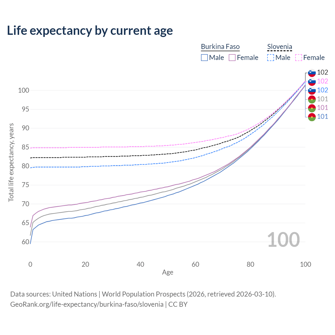 This life expectancy calculator shows the odds of living to 100, 95, 90, and below based on current age for both males and females in Burkina Faso and Slovenia, along with mean and median age of death. The calculations are based on the 2026 life tables (actuarial tables) from the UN World Population Prospects.