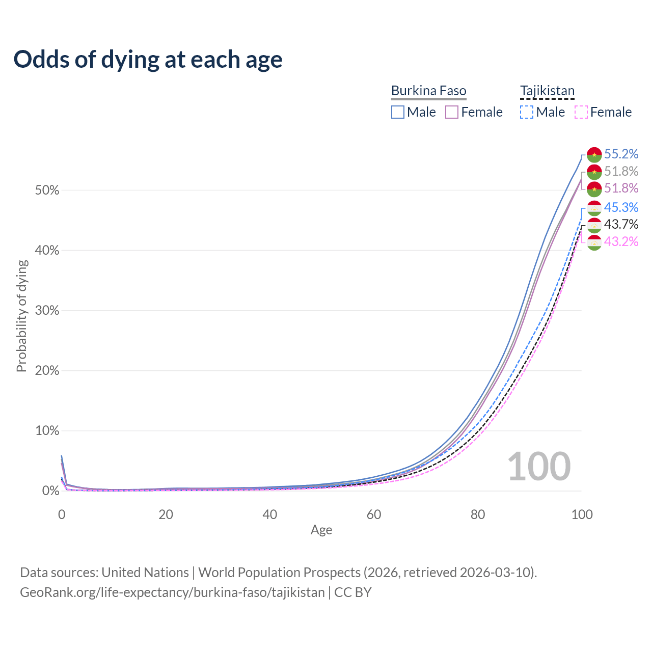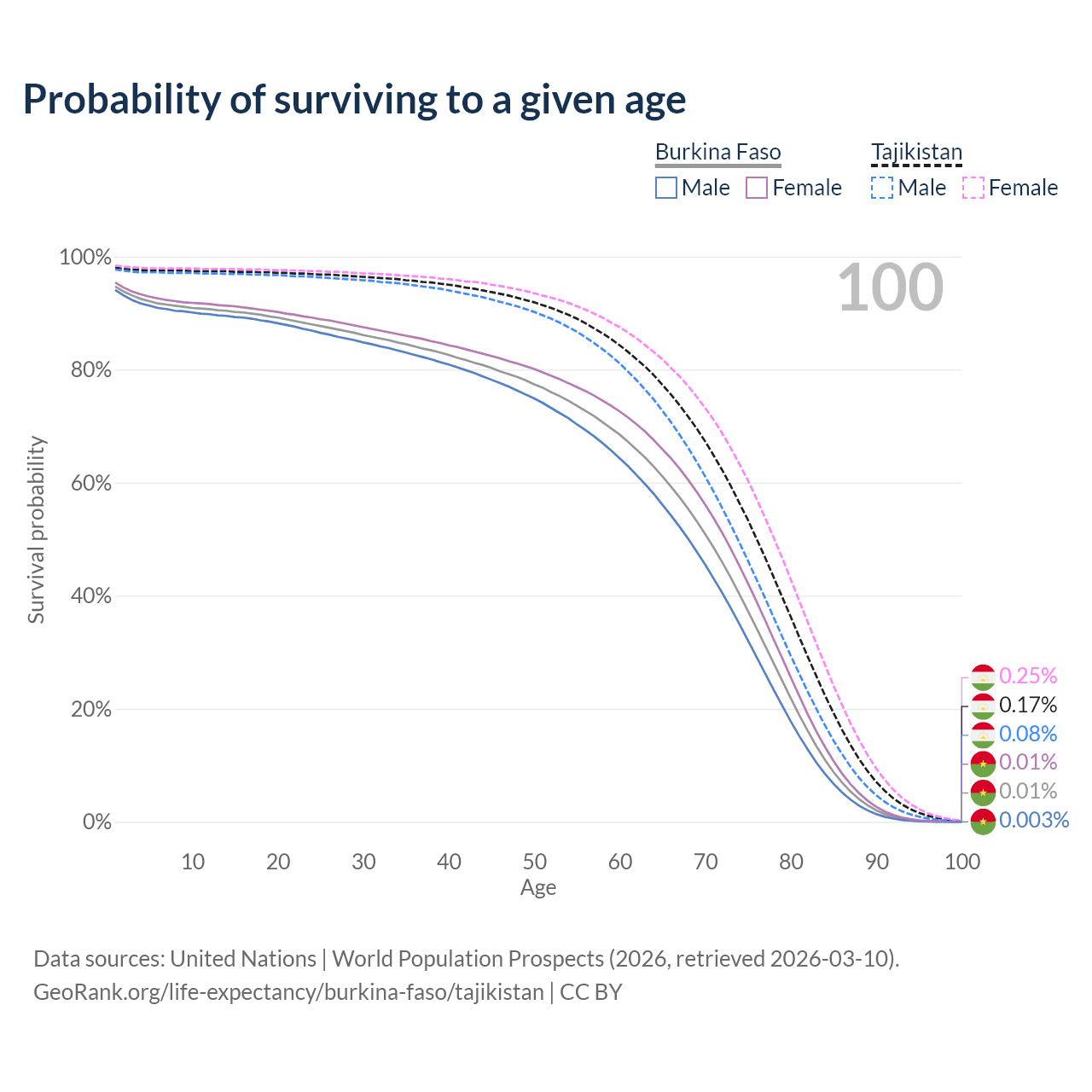 This life expectancy calculator shows the odds of living to 100, 95, 90, and below based on current age for both males and females in Burkina Faso and Tajikistan, along with mean and median age of death. The calculations are based on the 2026 life tables (actuarial tables) from the UN World Population Prospects.