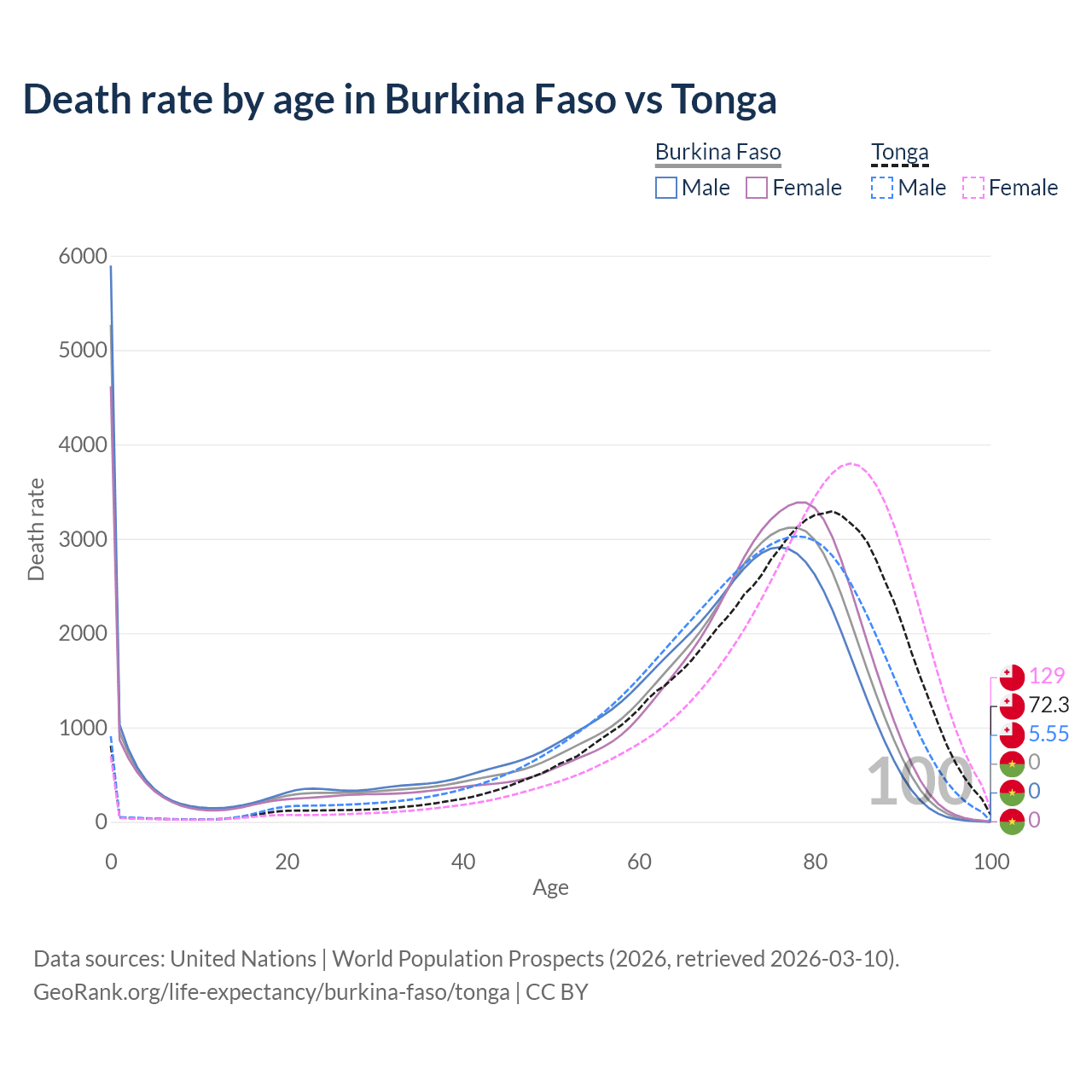 In Burkina Faso, the most common age of death is 0, compared to 82 in Tonga. The median age of death is 70.4 in Burkina Faso and 77 in Tonga, meaning only half of each cohort is expected to live past that age.