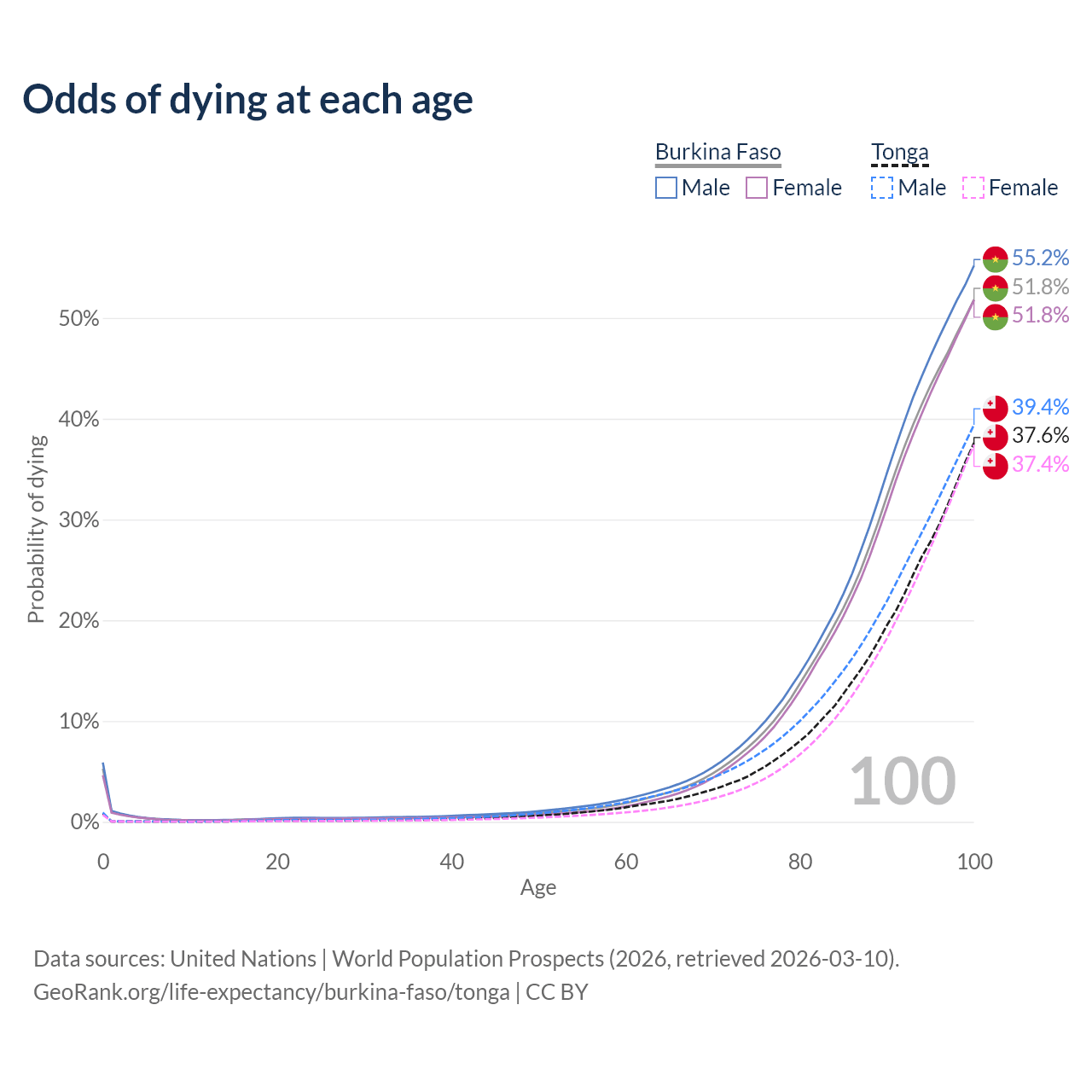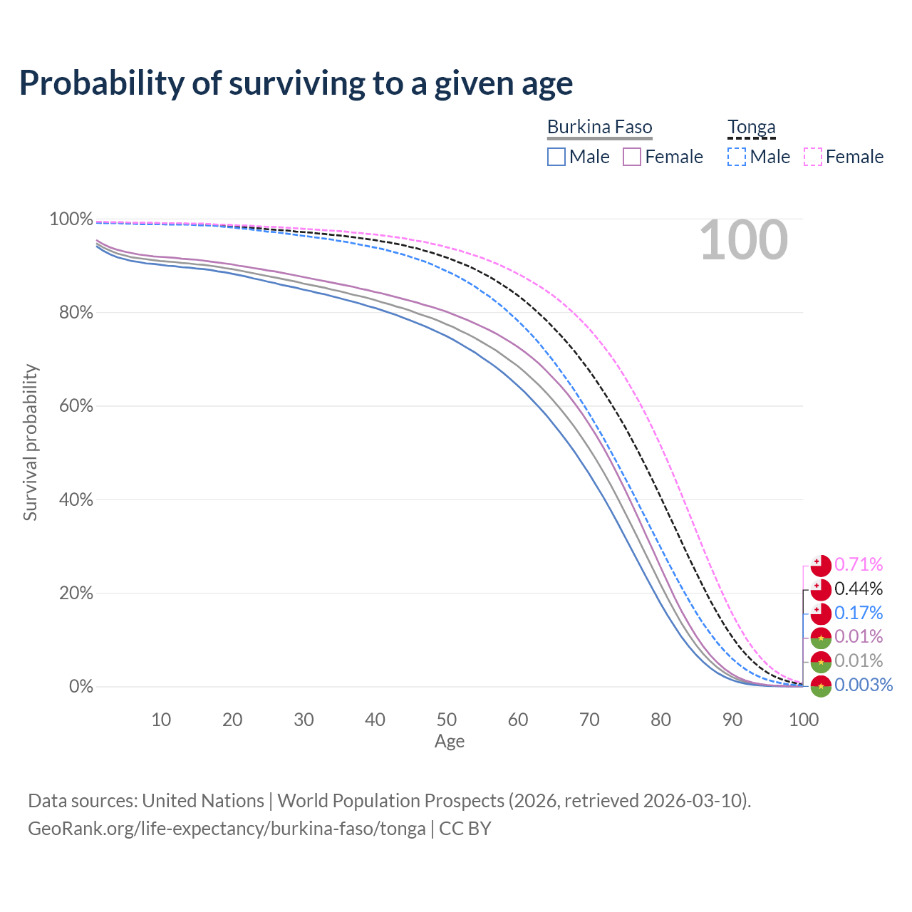 This life expectancy calculator shows the odds of living to 100, 95, 90, and below based on current age for both males and females in Burkina Faso and Tonga, along with mean and median age of death. The calculations are based on the 2026 life tables (actuarial tables) from the UN World Population Prospects.