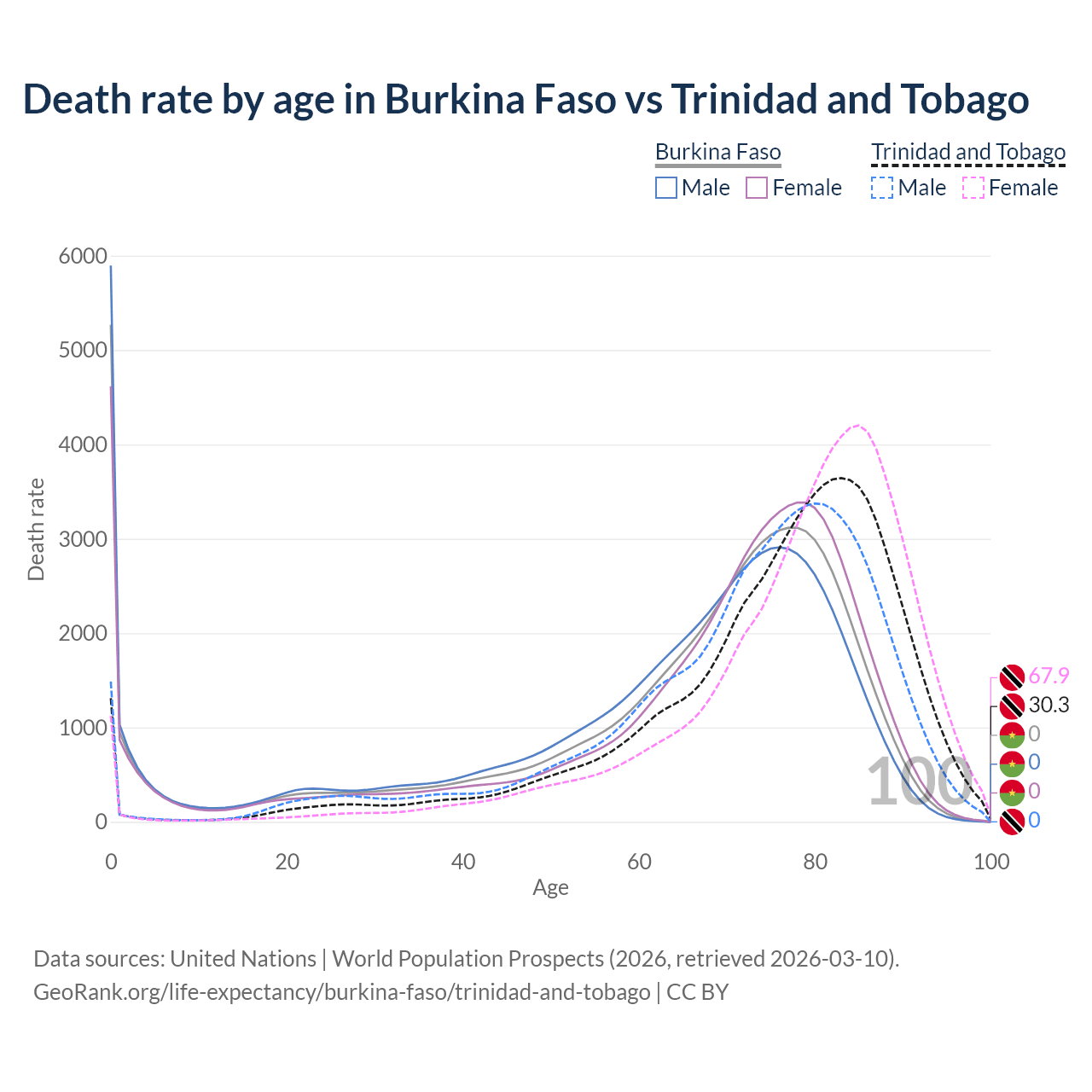 In Burkina Faso, the most common age of death is 0, compared to 83 in Trinidad and Tobago. The median age of death is 70.4 in Burkina Faso and 78.4 in Trinidad and Tobago, meaning only half of each cohort is expected to live past that age.