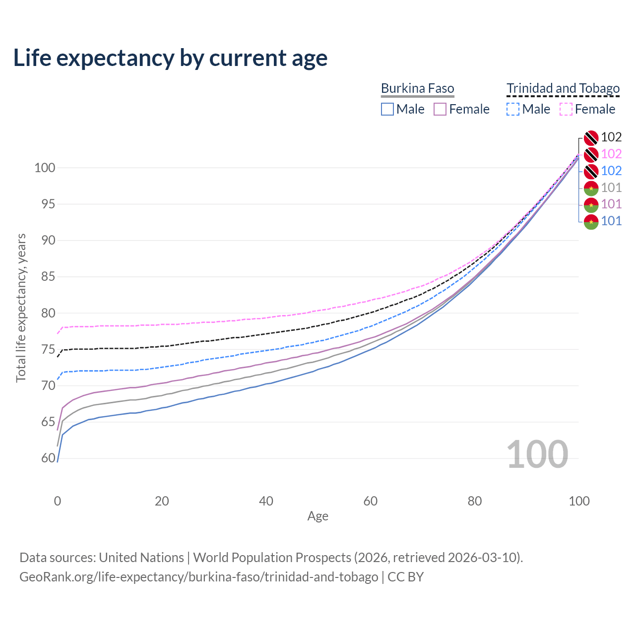 This life expectancy calculator shows the odds of living to 100, 95, 90, and below based on current age for both males and females in Burkina Faso and Trinidad and Tobago, along with mean and median age of death. The calculations are based on the 2026 life tables (actuarial tables) from the UN World Population Prospects.