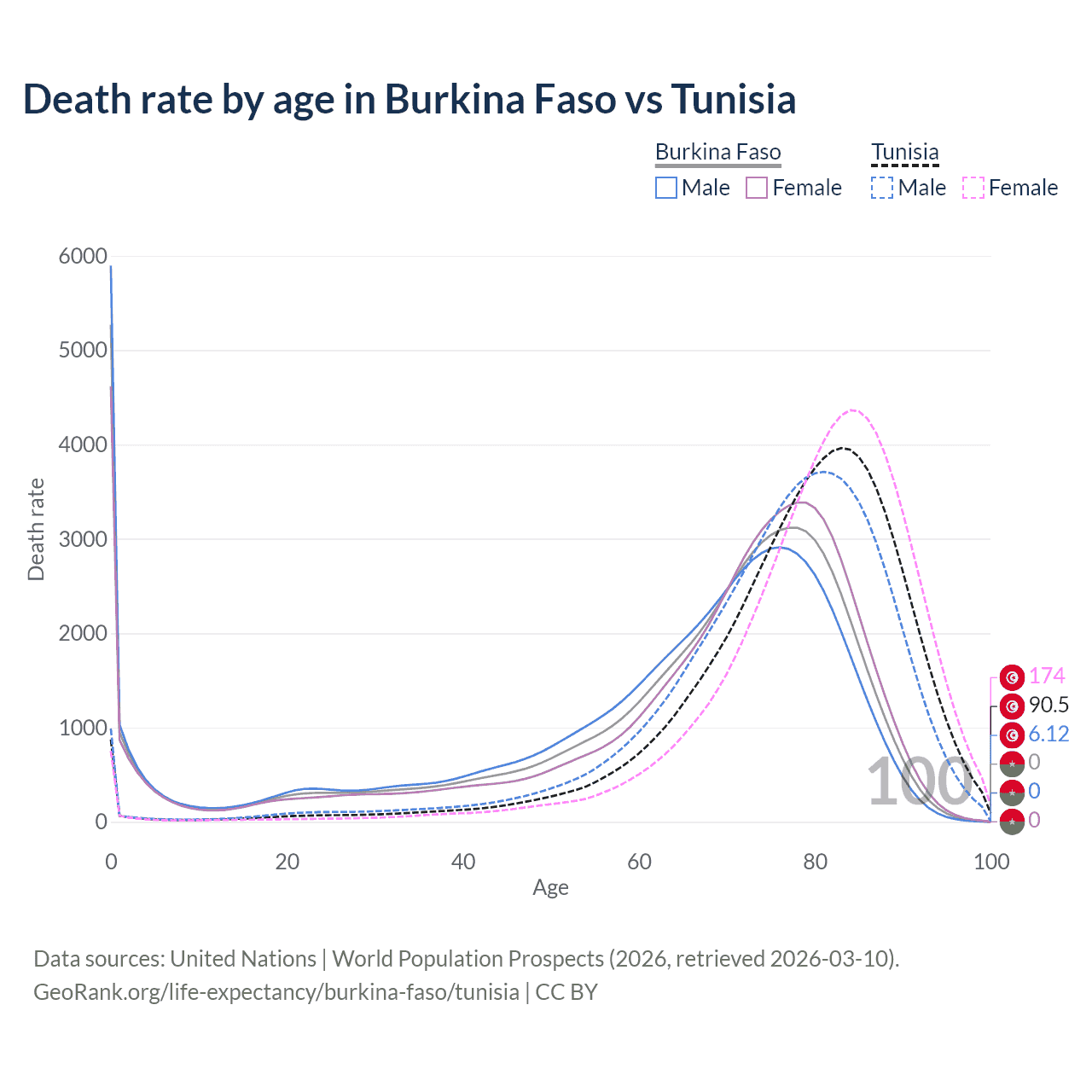 In Burkina Faso, the most common age of death is 0, compared to 83 in Tunisia. The median age of death is 70.4 in Burkina Faso and 80.2 in Tunisia, meaning only half of each cohort is expected to live past that age.