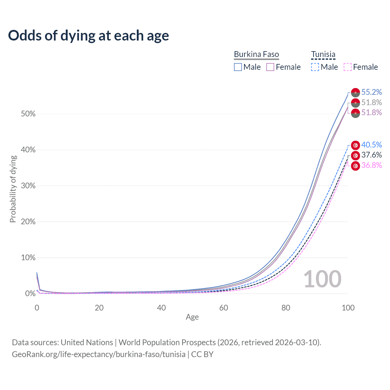 This life expectancy calculator shows the odds of living to 100, 95, 90, and below based on current age for both males and females in Burkina Faso and Tunisia, along with mean and median age of death. The calculations are based on the 2026 life tables (actuarial tables) from the UN World Population Prospects.
