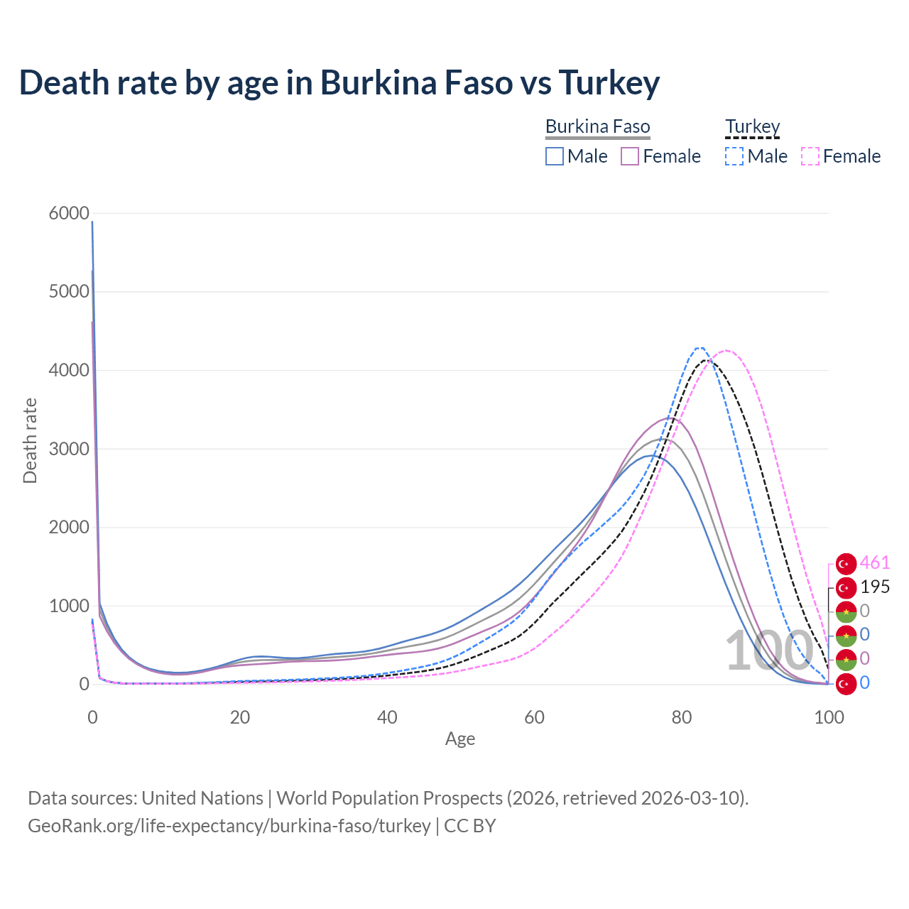 In Burkina Faso, the most common age of death is 0, compared to 83 in Turkey. The median age of death is 70.4 in Burkina Faso and 81.4 in Turkey, meaning only half of each cohort is expected to live past that age.