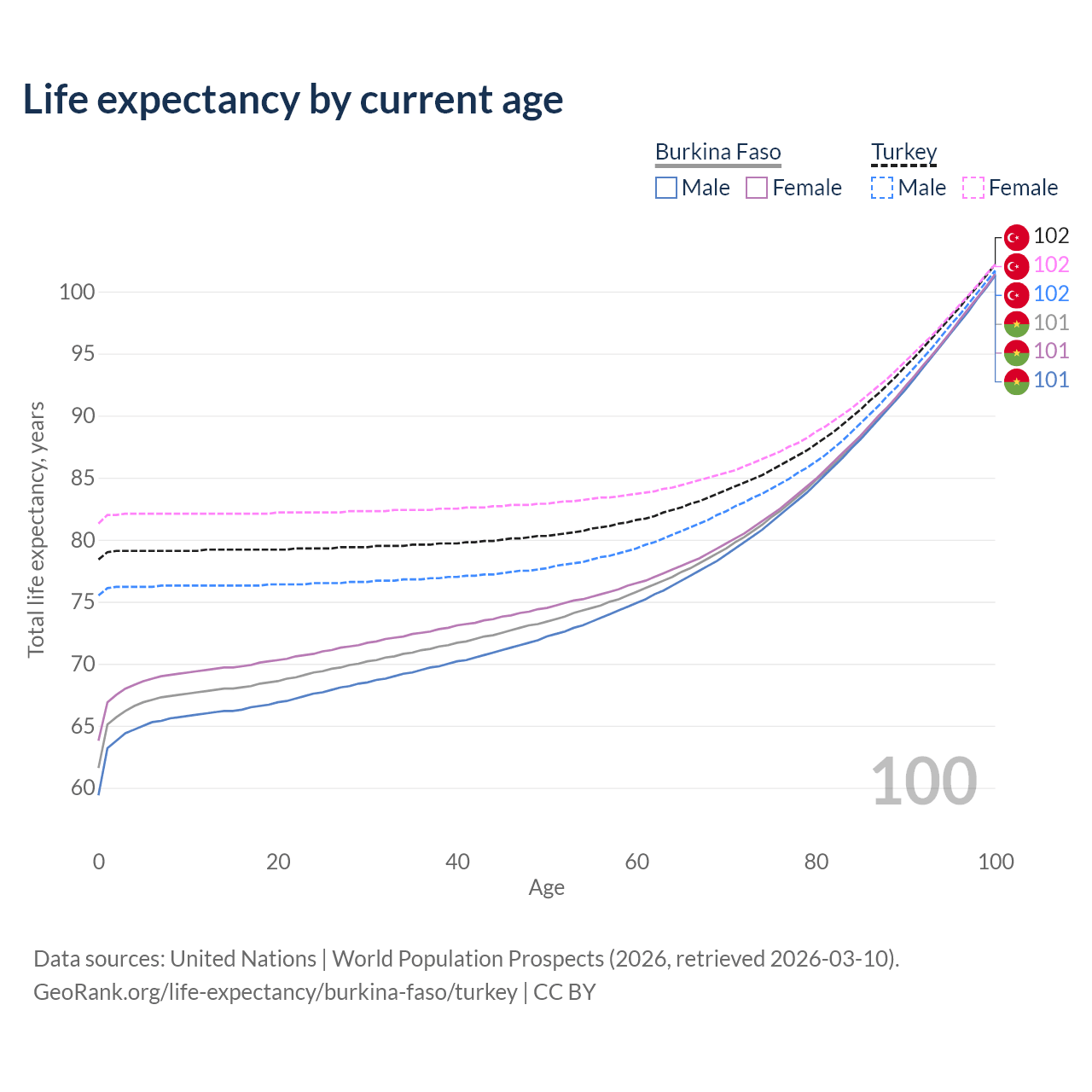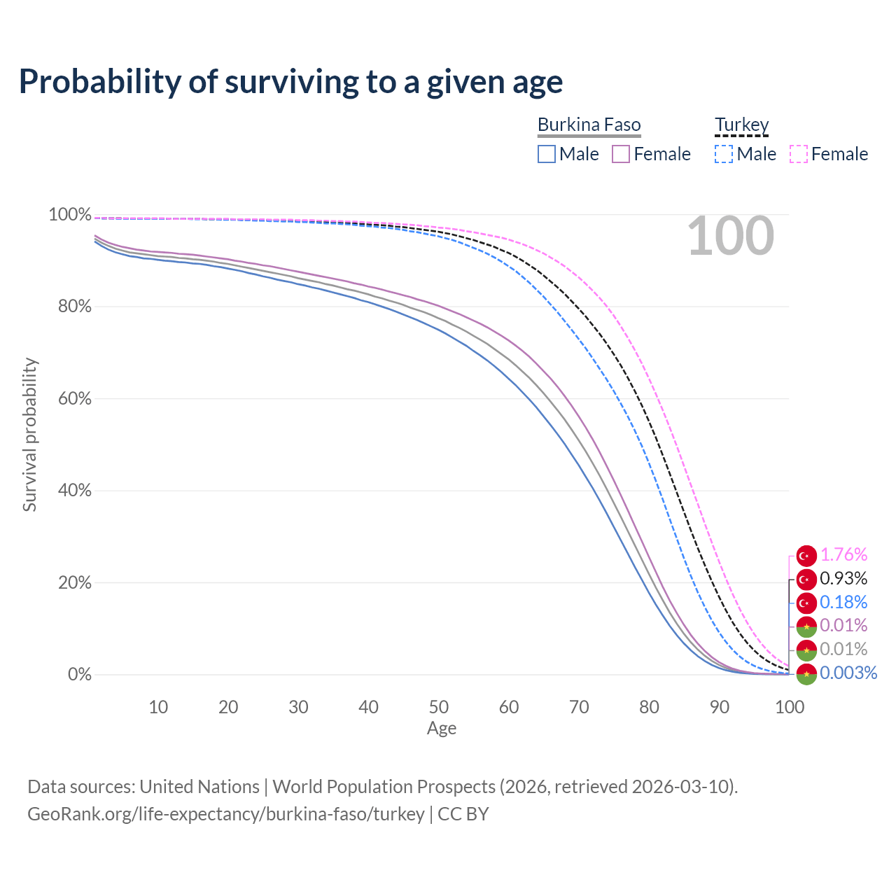 This life expectancy calculator shows the odds of living to 100, 95, 90, and below based on current age for both males and females in Burkina Faso and Turkey, along with mean and median age of death. The calculations are based on the 2026 life tables (actuarial tables) from the UN World Population Prospects.