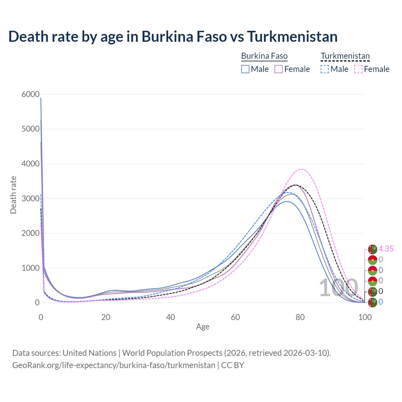 This life expectancy calculator shows the odds of living to 100, 95, 90, and below based on current age for both males and females in Burkina Faso and Turkmenistan, along with mean and median age of death. The calculations are based on the 2026 life tables (actuarial tables) from the UN World Population Prospects.