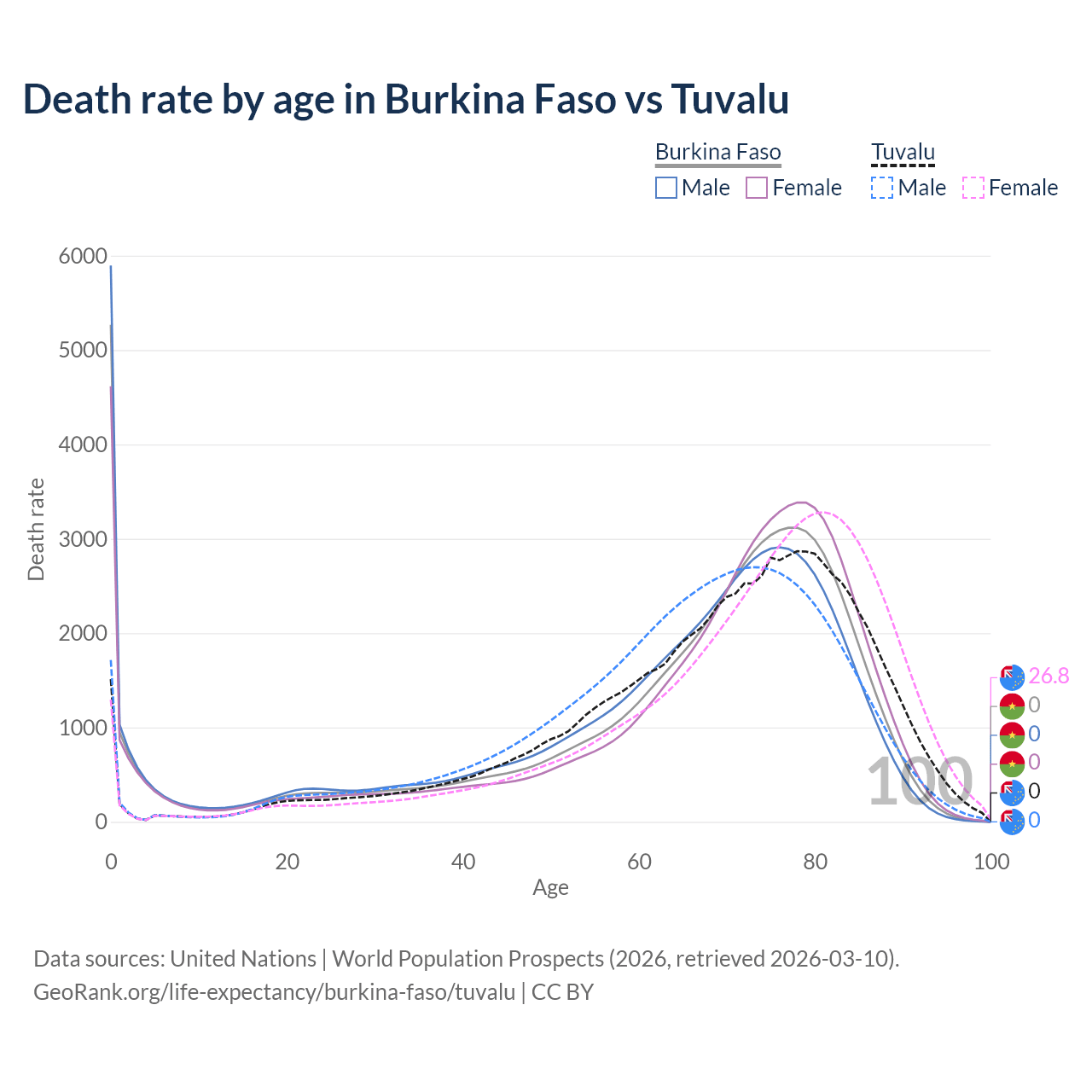 In Burkina Faso, the most common age of death is 0, compared to 78 in Tuvalu. The median age of death is 70.4 in Burkina Faso and 71.9 in Tuvalu, meaning only half of each cohort is expected to live past that age.