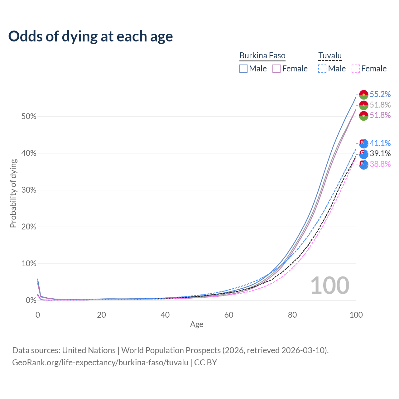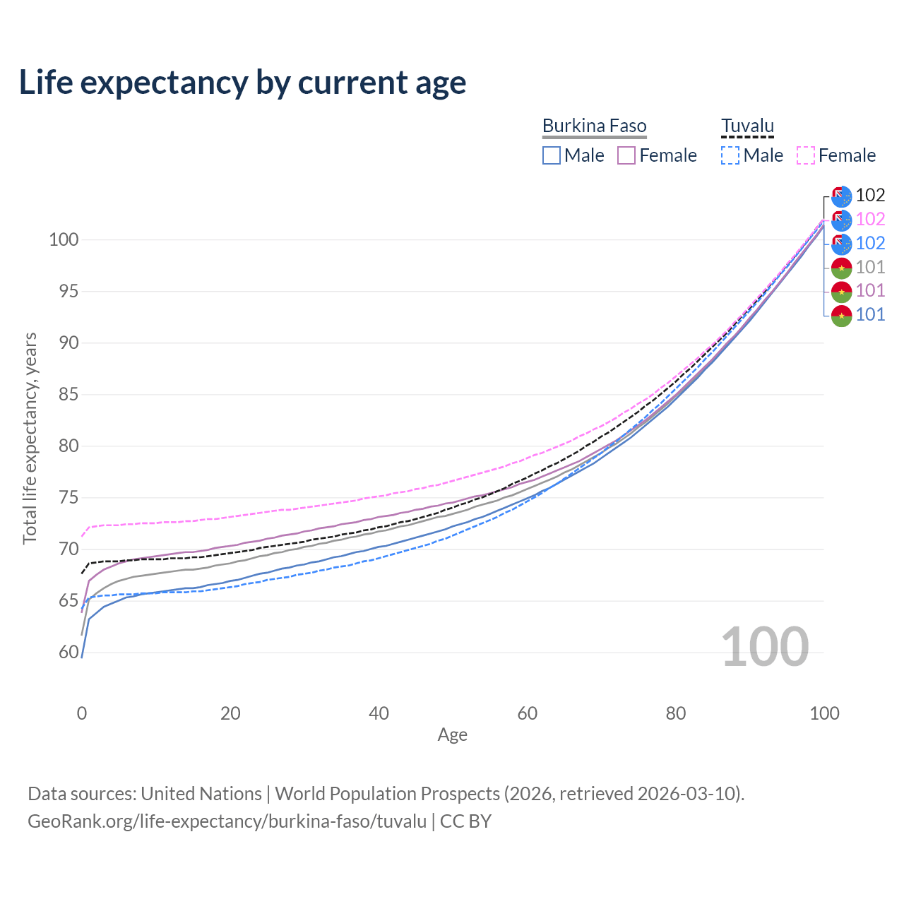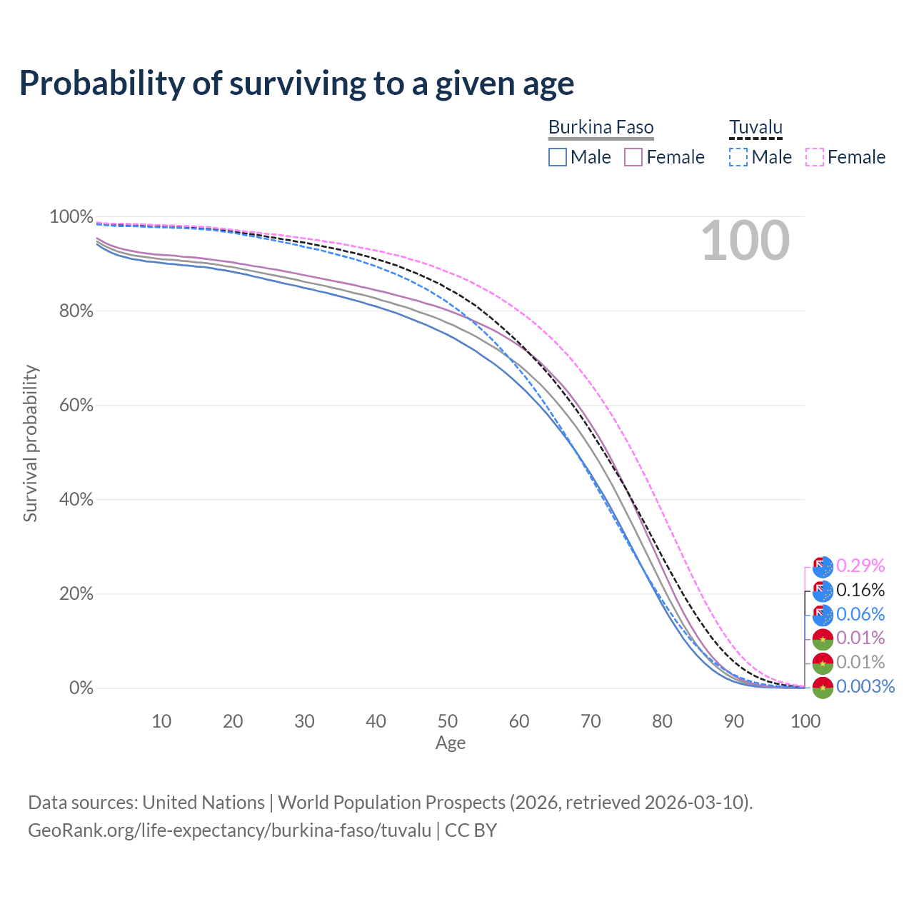 This life expectancy calculator shows the odds of living to 100, 95, 90, and below based on current age for both males and females in Burkina Faso and Tuvalu, along with mean and median age of death. The calculations are based on the 2026 life tables (actuarial tables) from the UN World Population Prospects.