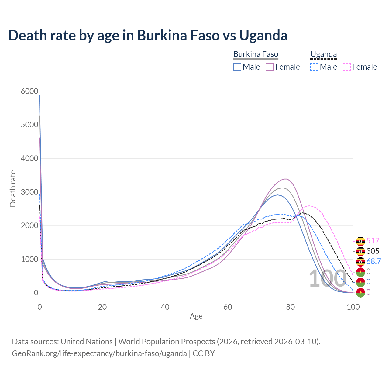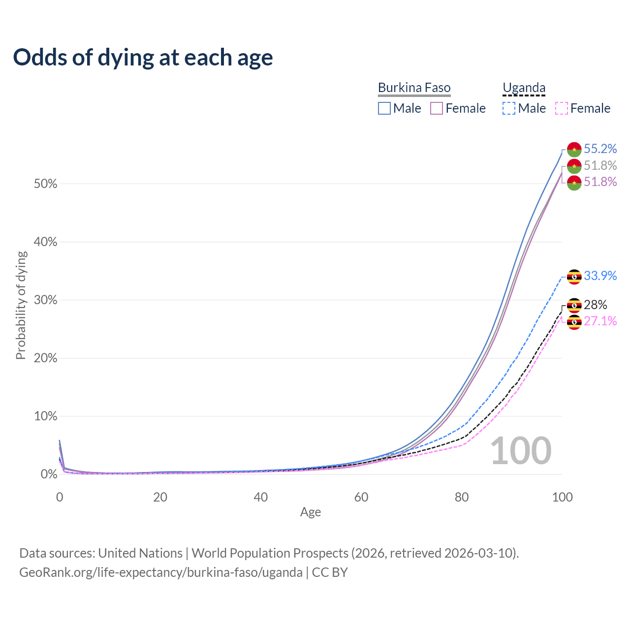 This life expectancy calculator shows the odds of living to 100, 95, 90, and below based on current age for both males and females in Burkina Faso and Uganda, along with mean and median age of death. The calculations are based on the 2026 life tables (actuarial tables) from the UN World Population Prospects.