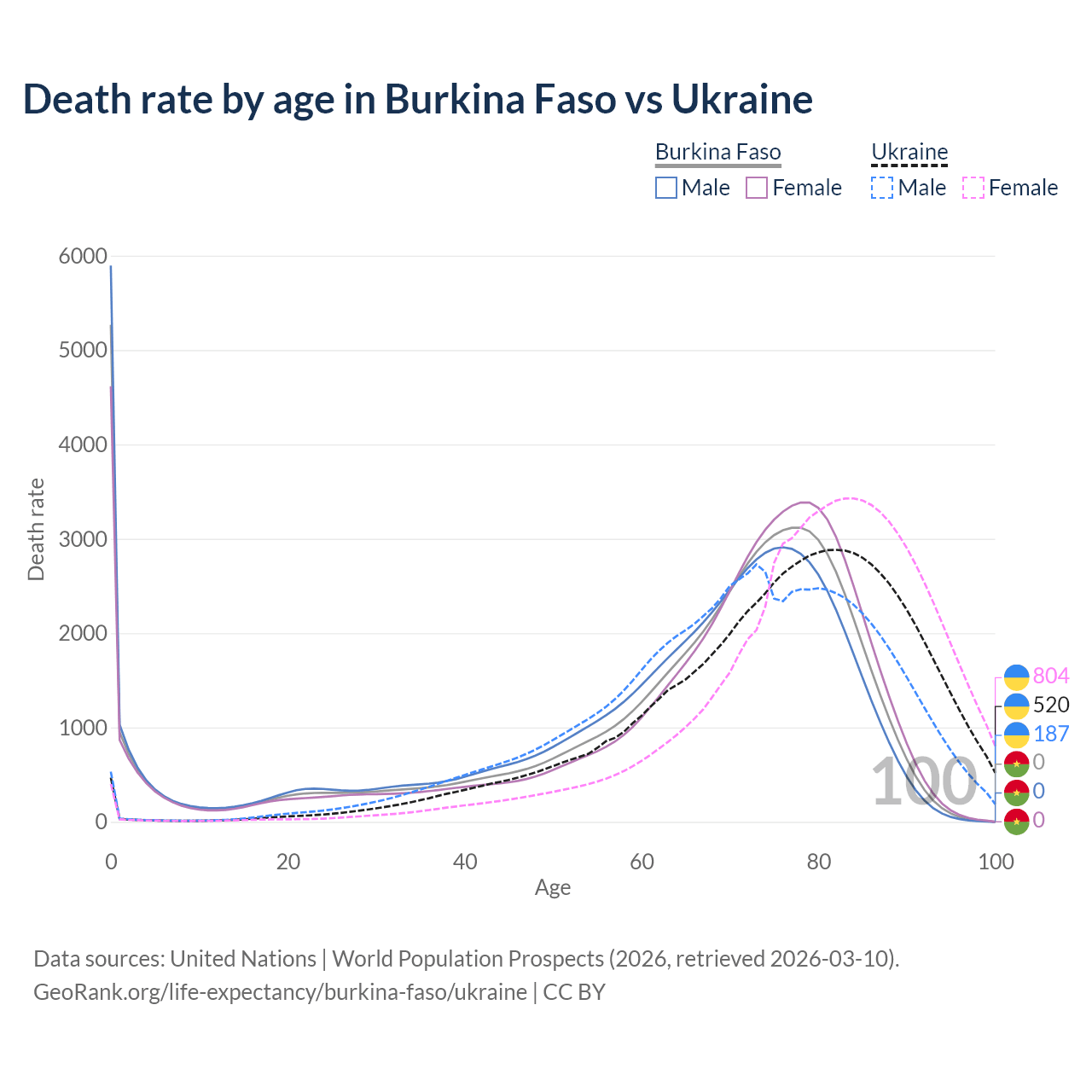 In Burkina Faso, the most common age of death is 0, compared to 82 in Ukraine. The median age of death is 70.4 in Burkina Faso and 78 in Ukraine, meaning only half of each cohort is expected to live past that age.