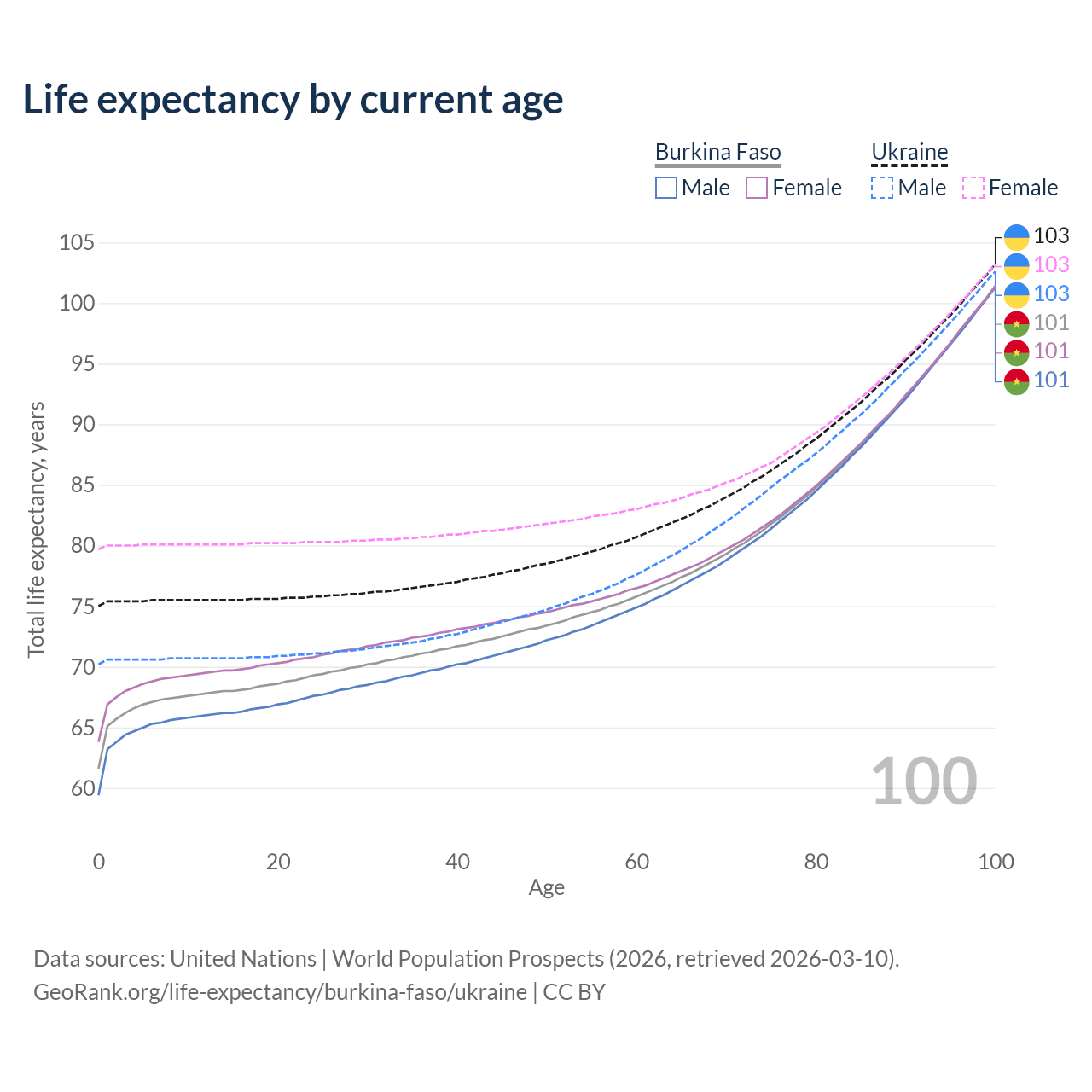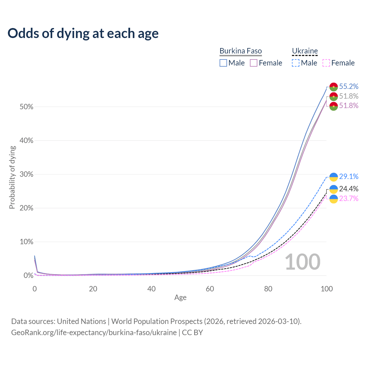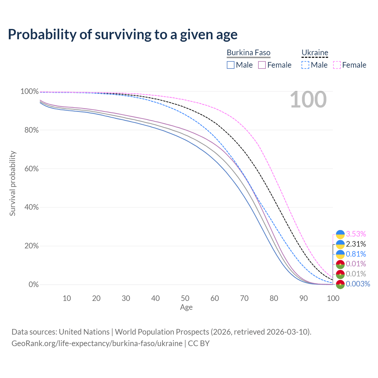 This life expectancy calculator shows the odds of living to 100, 95, 90, and below based on current age for both males and females in Burkina Faso and Ukraine, along with mean and median age of death. The calculations are based on the 2026 life tables (actuarial tables) from the UN World Population Prospects.