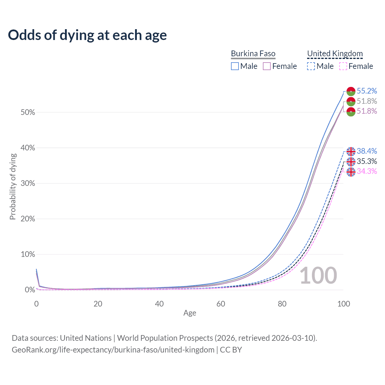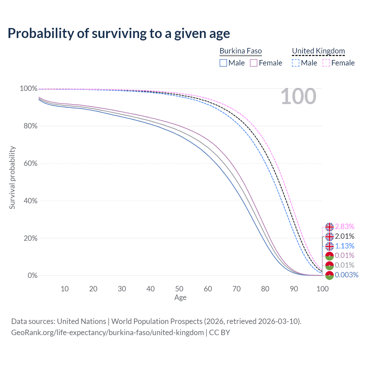 This life expectancy calculator shows the odds of living to 100, 95, 90, and below based on current age for both males and females in Burkina Faso and the United Kingdom, along with mean and median age of death. The calculations are based on the 2026 life tables (actuarial tables) from the UN World Population Prospects.